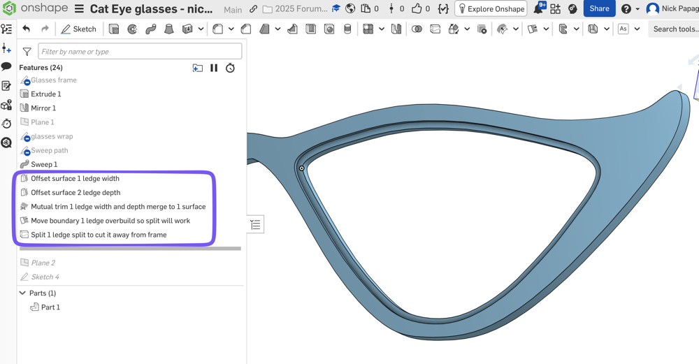 One more since you're new to OS, you can model everything together in the same part studio. The frame, the lens, the temple, etc. (and mirror all at the end).