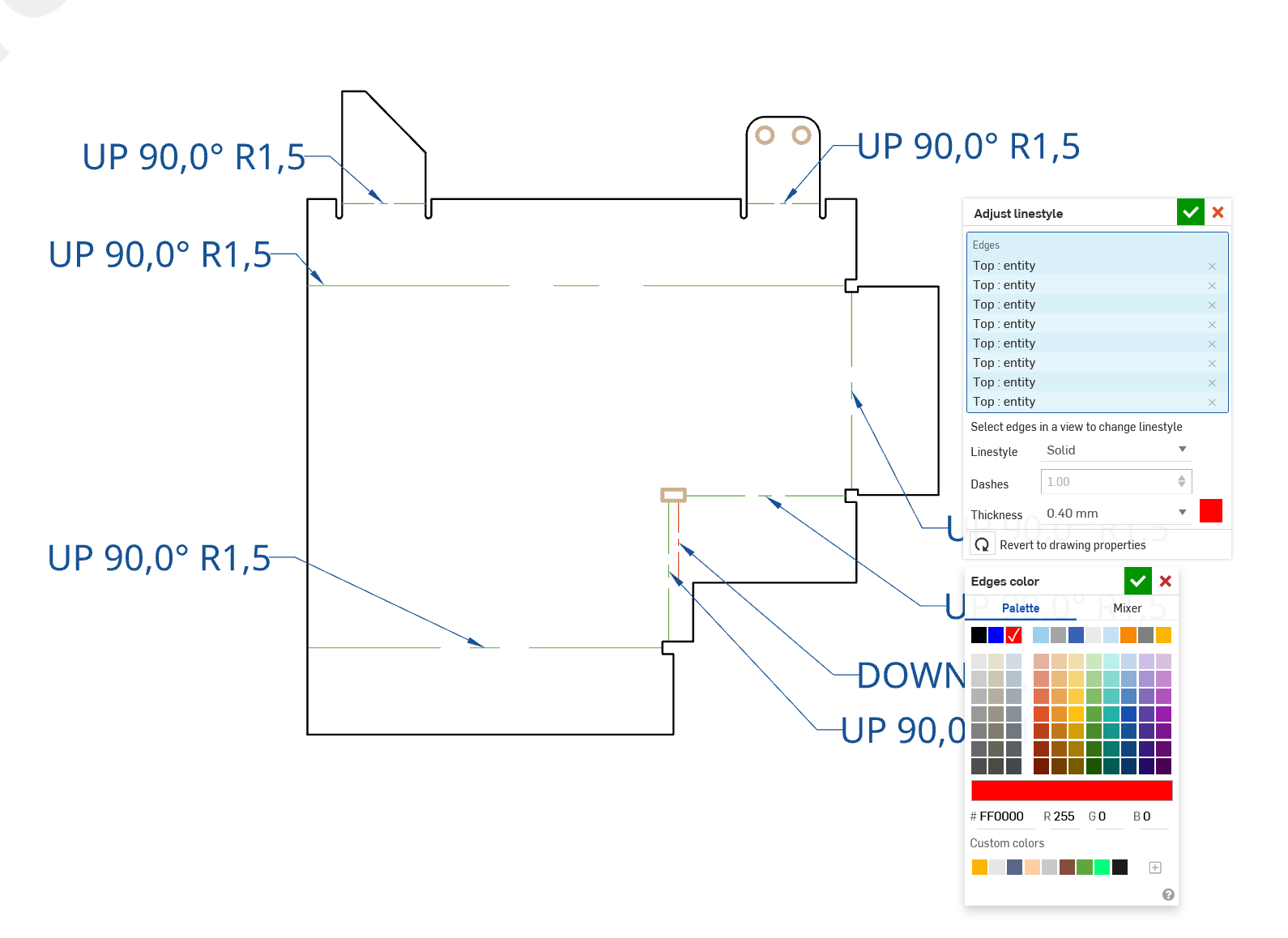 You can change the colour of lines/curves in the drawing views. I do that for laser cutting/bending, for example. My laser software can then mark bend lines on sheets or cut different colurs in a sequence (like holes first).