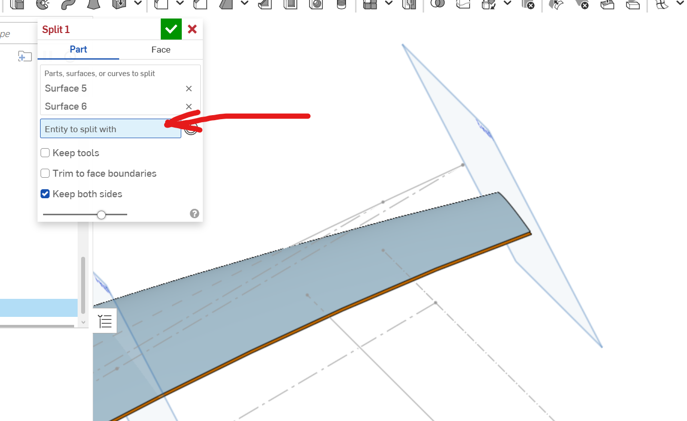 Onshape has two shorter dialog boxes to do the same thing. But you don’t have to close the first dialog (Split) to start executing the second dialog (Delete face) and because of this, it almost acts like a single longer dialog box