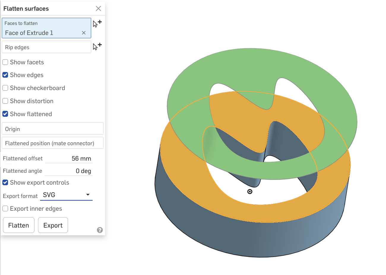 • For Freeform Shapes, The Flatten tool is probably easier to use since it’s built-in and exports an SVG right away, but it also can’t handle multiple faces (though going through them separately is fairly quick).