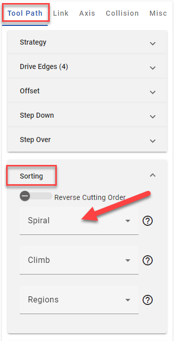 You can also change the sorting to "Spiral." This will gradually walk the tool into material as it machines the part. This prevents the tool from dramatically stepping over in the material.
