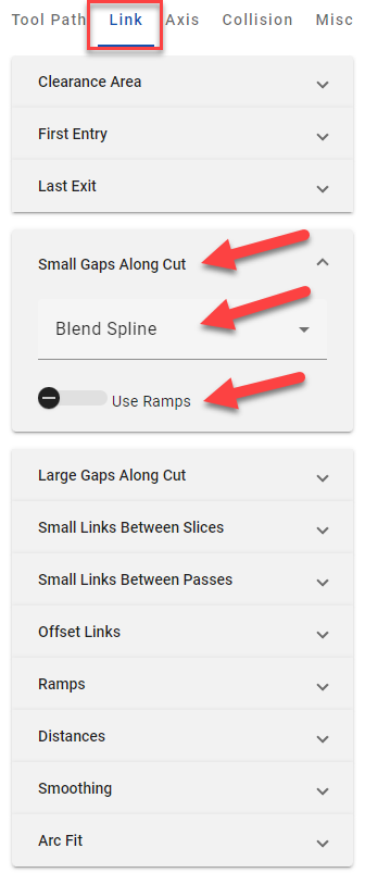 This issue is something that will be solved as we refine the toolpath strategies and include default settings for users. Today, the settings are in raw form and require the user to change them to refine the toolpath. The "link" section drives a lot of the settings you are looking to adjust.