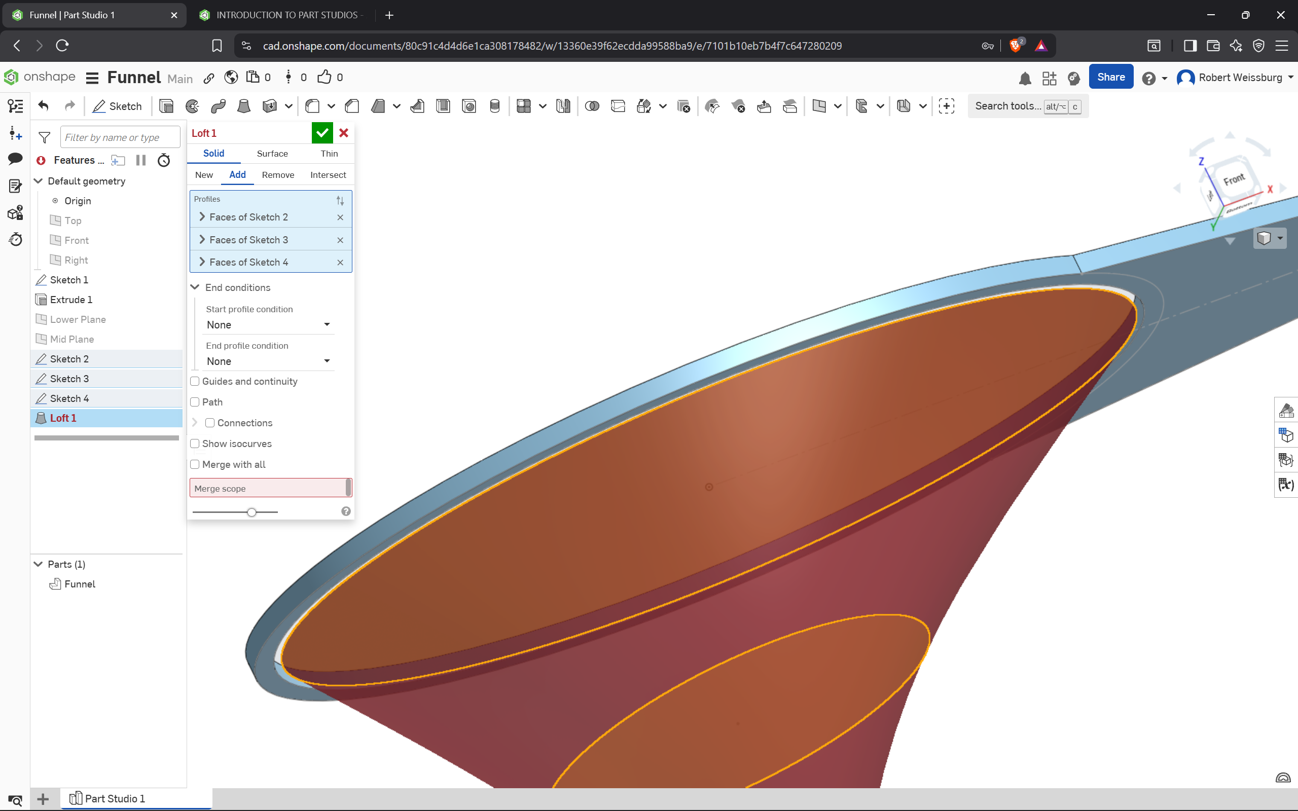 I am currently working through the Introduction to part studios advanced features exercise funnel on the OnShape tutorials. This is driving me crazy, i am on part 9 trying to loft the profiles but it will not work no matter what I try. It keeps highlighting the inner line red and not allowing the loft to happen. Any help would be appreciated!