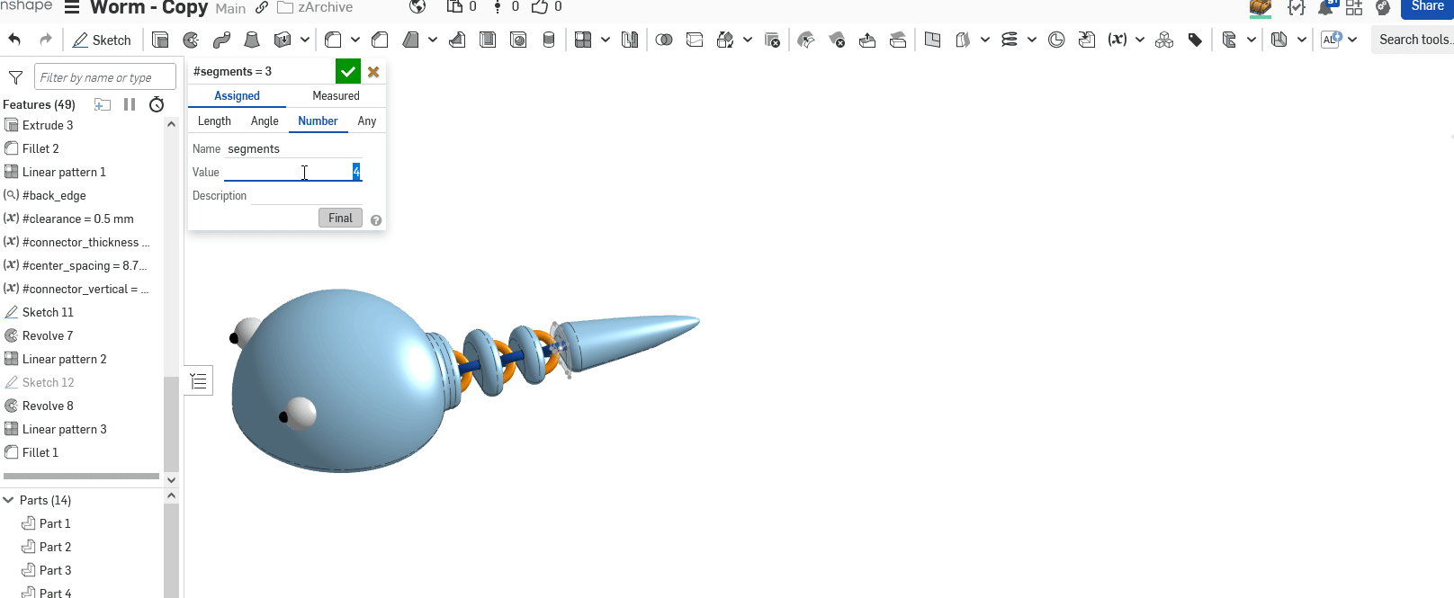 NB it seems the worm-segments are not attached to be one part. Perhaps the part studio should only contain one separate segment, and the pattern should be done in the subsequent assembly.