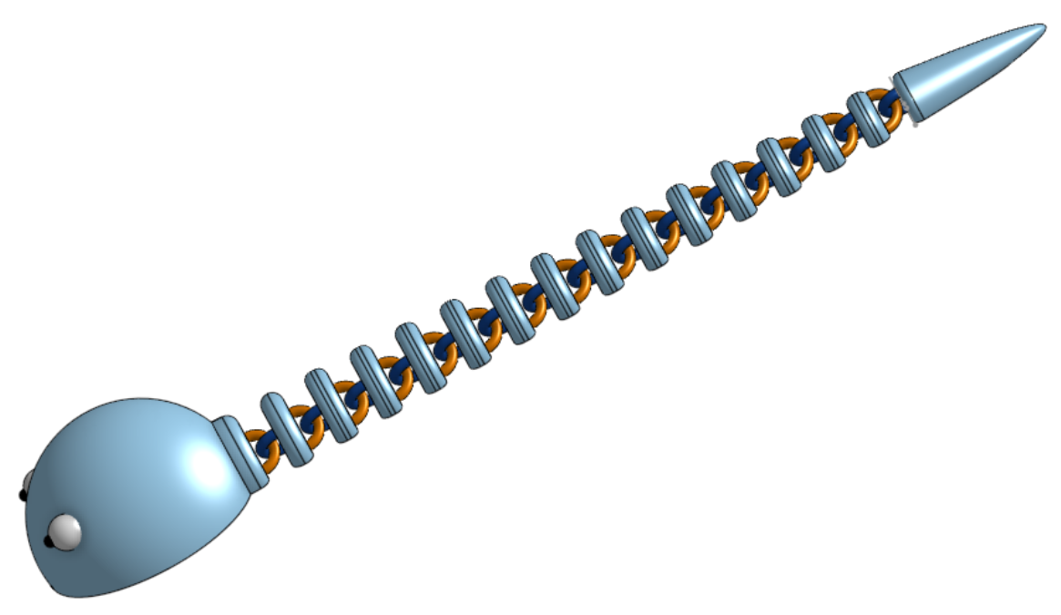The last thing I tried was a bounded surfaces pattern, which is what you will find in it. Key here is that if #segments is assigned a different number, we will get all the segments filleted on both sides. Eventually, a more worm-like body sheath may be developed that hides those connectors.