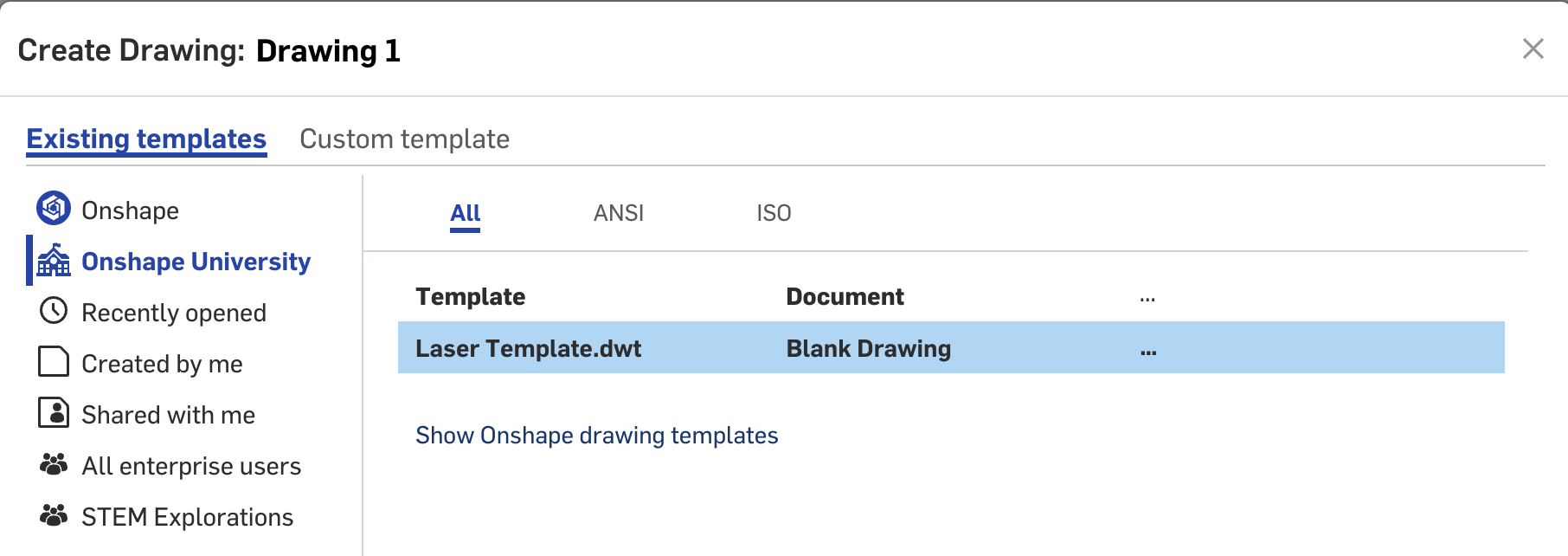 How can I create a blank template that would automatically show up for my students as a template choice when they create drawings (similar to the standard sizes A, B, C… that appear for selection choices).