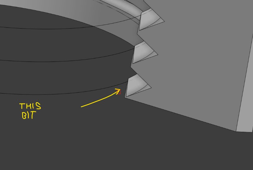I have not yet found an easy way to construct tapered threads in the custom library so have followed tutorials to have a go myself. I am halfway there except that in respect to the block thread, the side of the triangular cutting tool that is in line with the helix axis digs into the surface on one corner so the thread is not completely cut out (below). Also, I need to extend the thread at the top of the bolt (and bottom of block) as it currently just stops and doesn't carry through - I believe there is an extend boundary tool I can use for this.