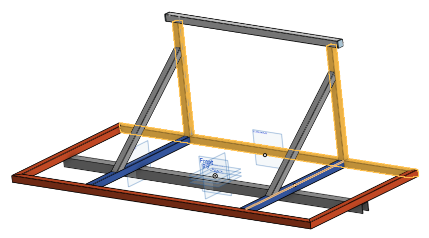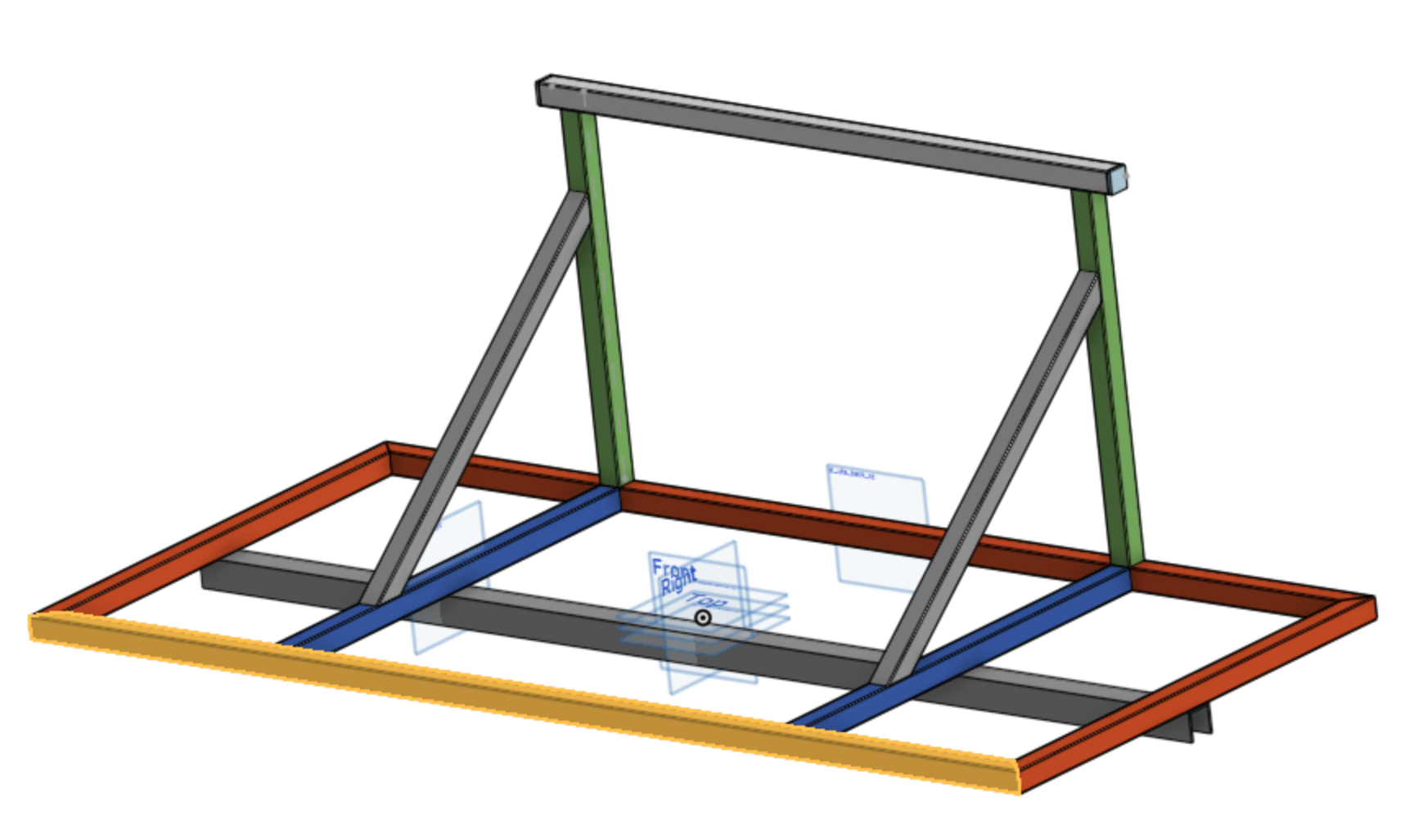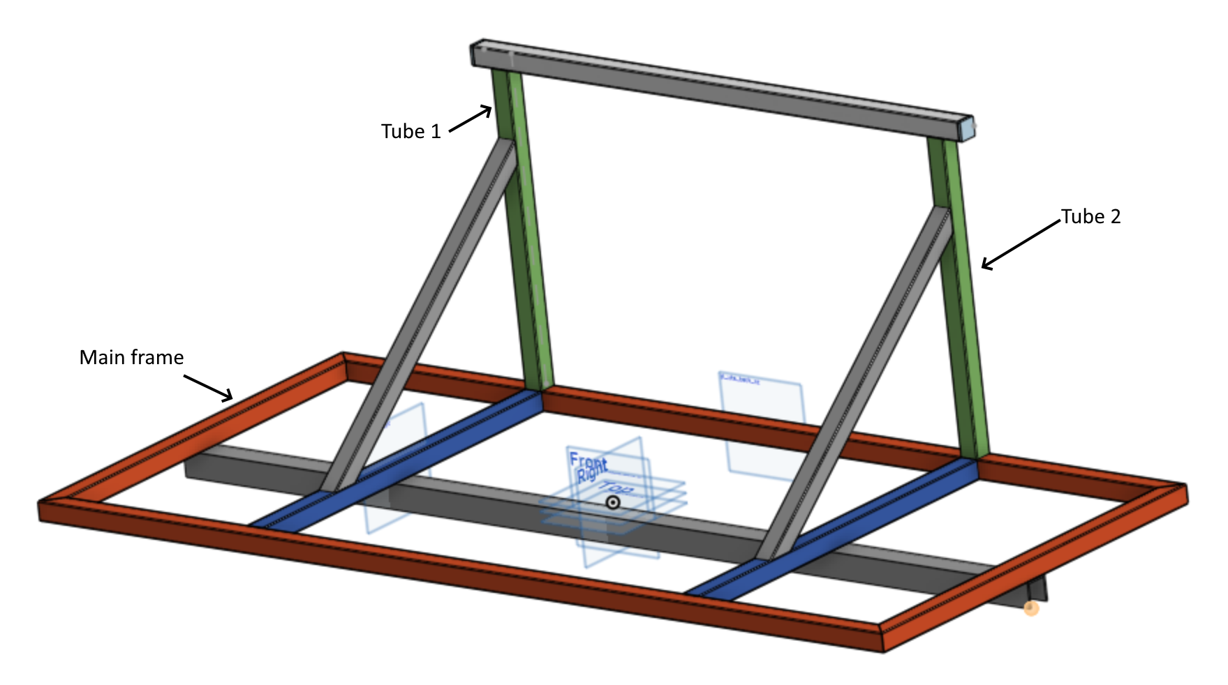 The main frame in red has been created using a rectangle in a sketch then the Frame feature with ISO rectangular tube.