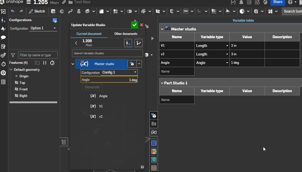 I want to be able to define a group of variables that will change based on configuration and that will be portable to different contexts - to multiple parts studios, to assemblies. This is now possible with Variable Studio Configurations.
