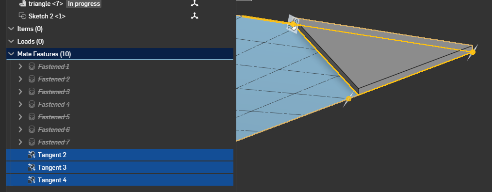 I'd like to model this to see how big I can make the triangular tiles and still get a reasonable walking surface. I've been manually fastening these together and tweaking the mate connector angles etc but it would be way easier if I could mate the three tile vertices to the surface like you would a vertex to a plane and then move them around/tweak sizes. Using a Tangent mate for each vertex and the surface seemed promising. Unfortunately, it appears you can't spec a surface in the tangent mate.