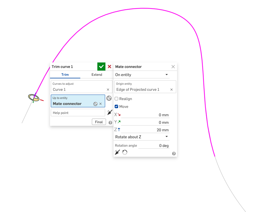This works really well in the case above and likely for the OP. Of course if the curve has some kind of curly hook at the end, the primary direction of the mate connector (which is automatically tangent to the curve) might need tweaking. You can use some other reference then for the primary direction.