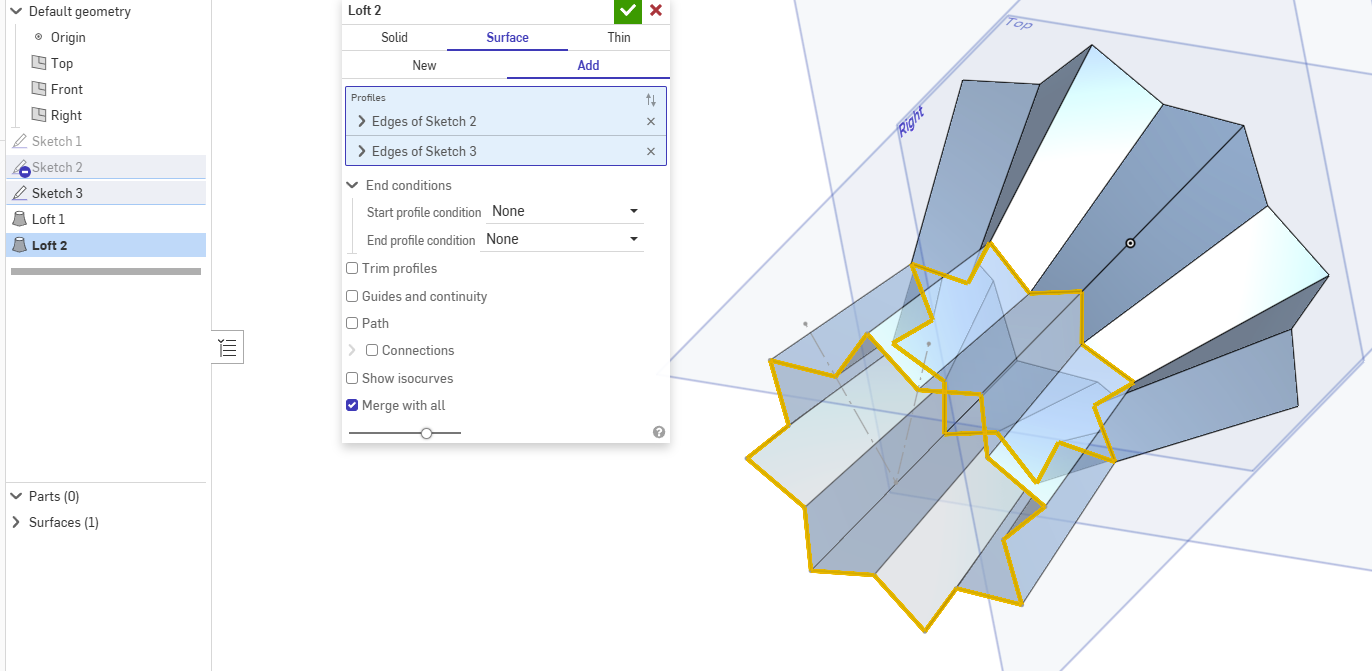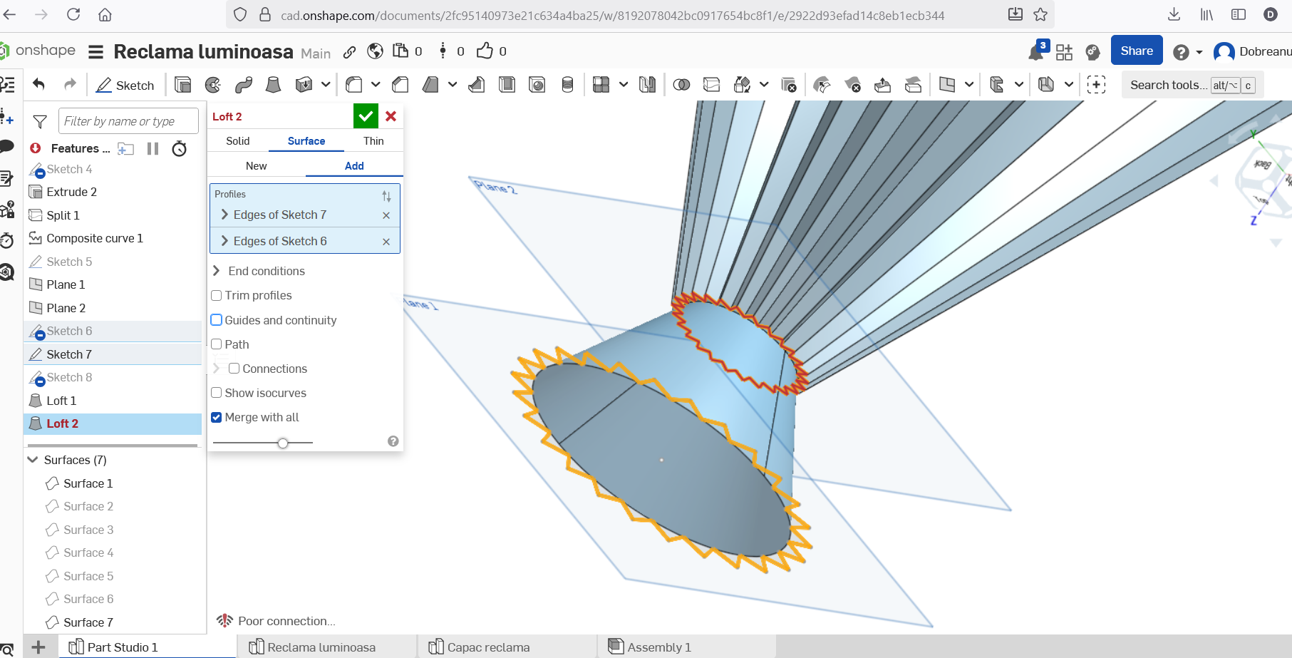 Can anyone tell me why I can't loft this again? They are both surface lofts, if I do solid they generate, but surface do not.