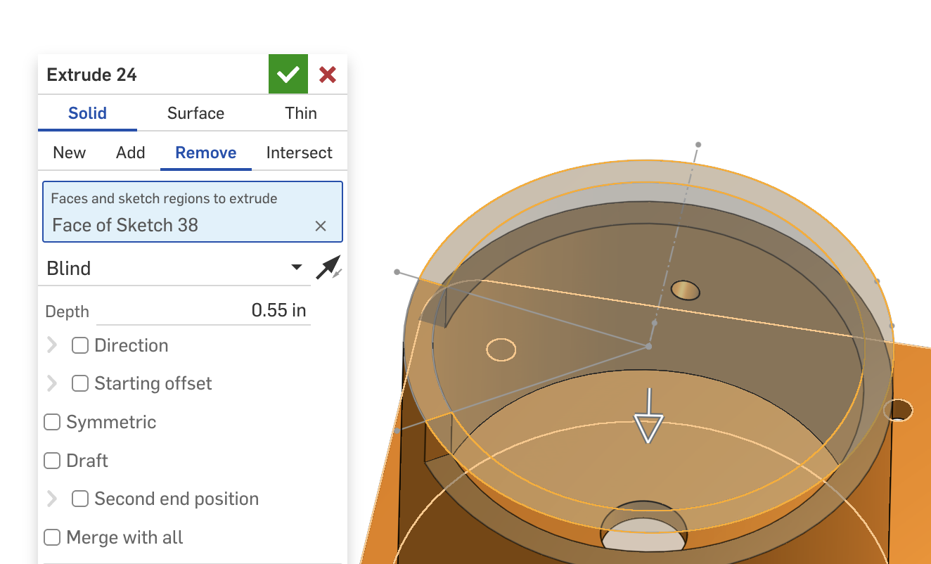 In Extrude 24, select the sketch area that you want to use as your cutting tool. Because the sketch is solved and the resulting faces are valid, it can cut away the area you want to remove.