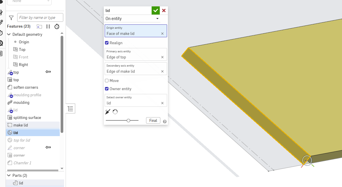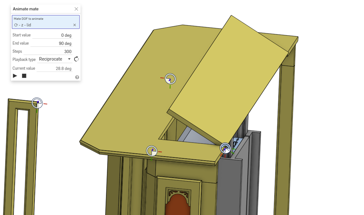 Hello all. I have a part studio containing two parts, a top and a lid. The lid was created by splitting the top with a surface. When adding a mate connector whose Z axis is perpendicular to the right or left plane, the X & Y axis of the mate connector are oriented to what looks like a 45 degree angle to horizontal or vertical. Trying to figure it out, I created a new piece from the right plane and a mate connector behaves as expected. The misorientation also happens if I add the mate connector to either of those two parts in Top Assy where they are used. What did I do to create this anomaly?- - Scotty