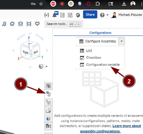 It is currently not possible to measure values within the assembly and then use them in configurations or configuration variables.
