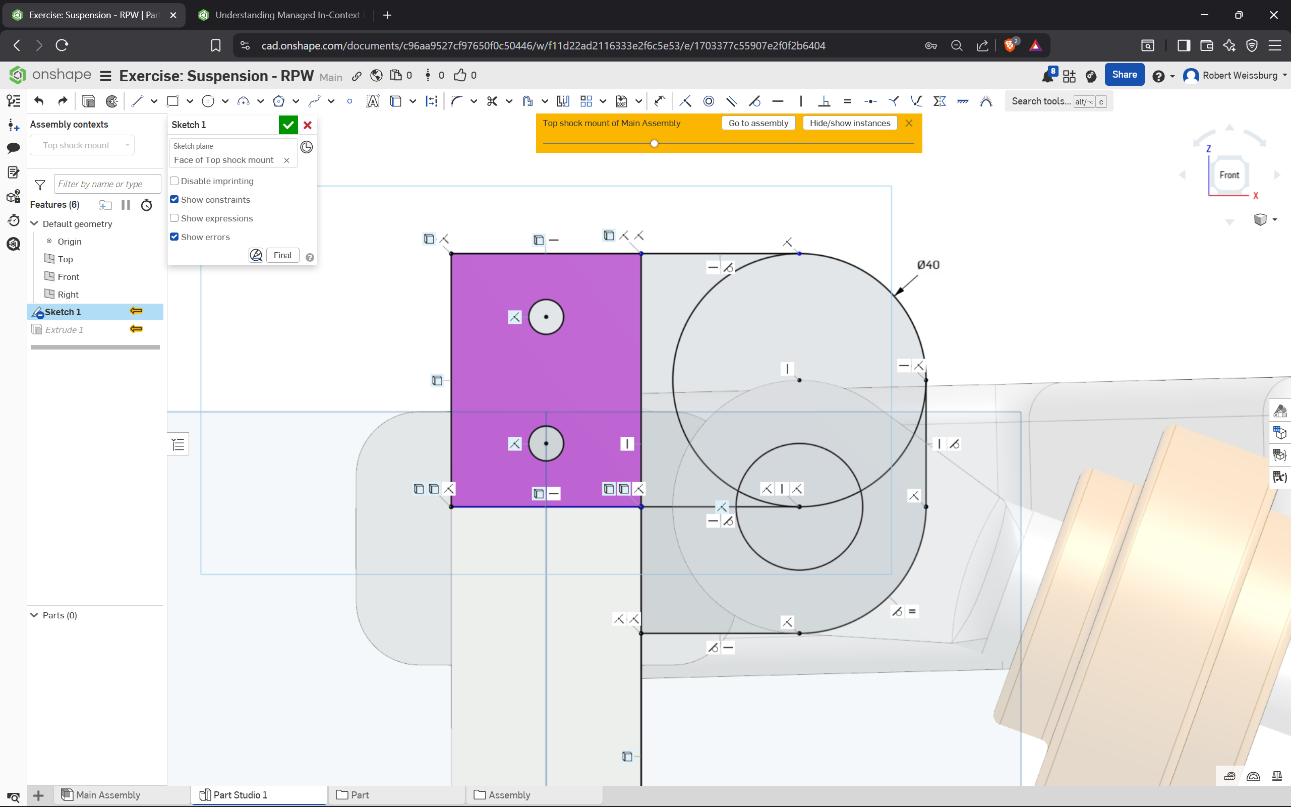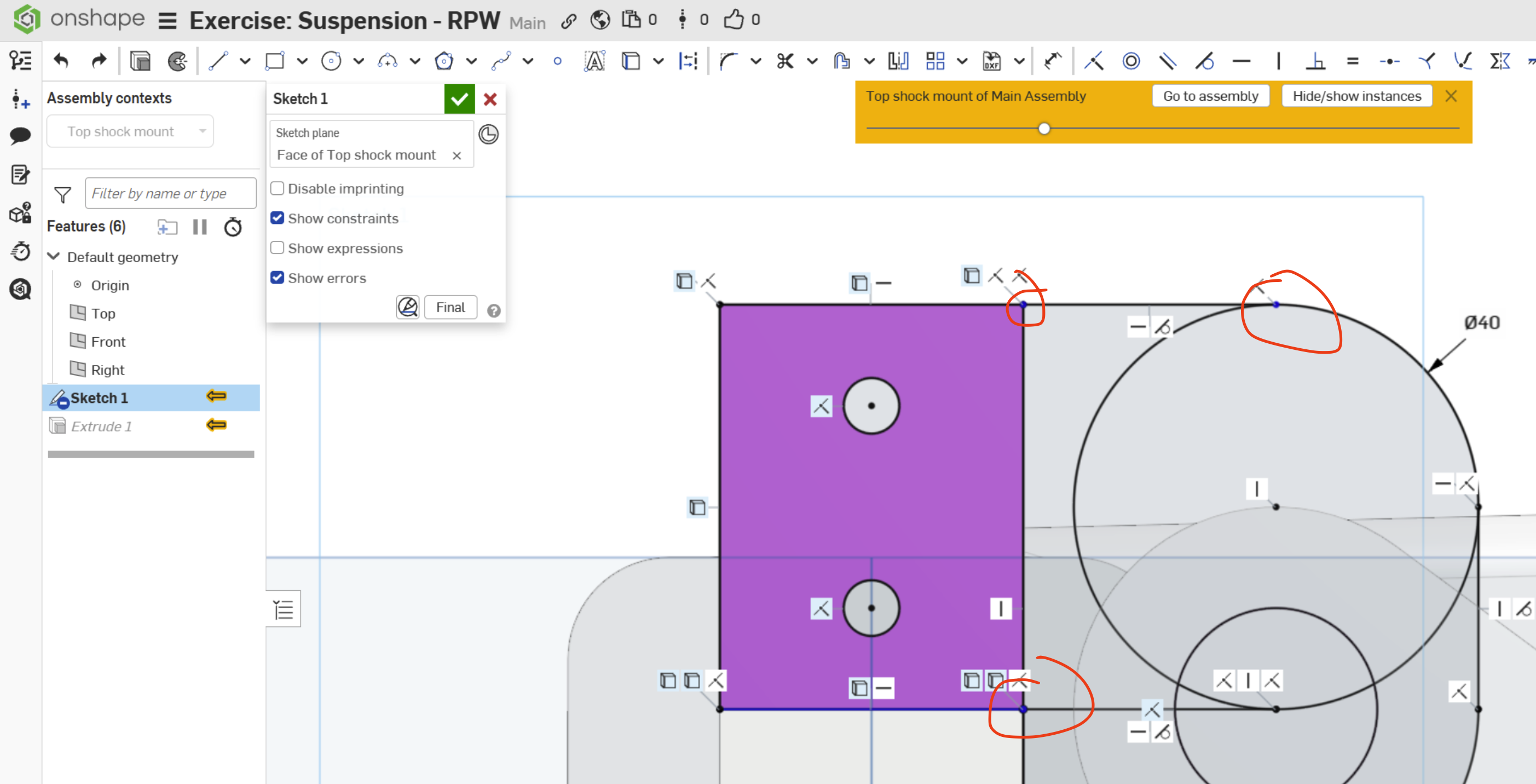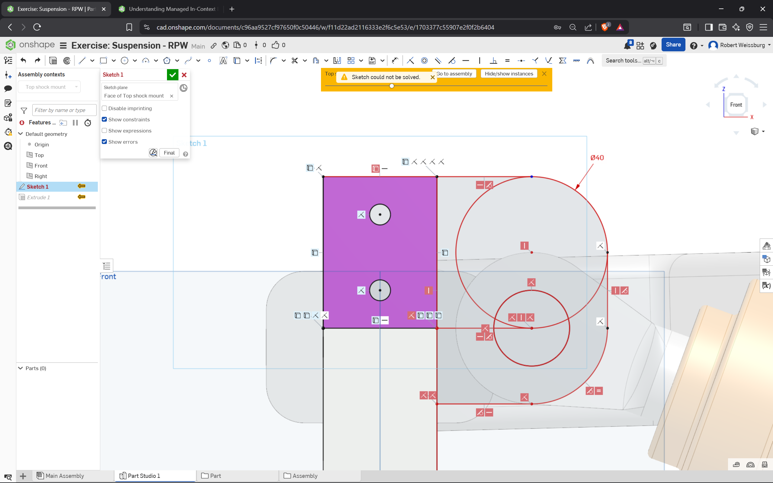 I added a few more constraints, but that didn't change the error. One thing I notice in yours and in the tutorial picture, the line on the bottom that is the right side of the angled block, running off the bottom of the image above is not part of the sketch in mine (gray), but is in yours and the tutorial. I can add a line there, but it doesn't change anything. It seems in yours it is part of the Use. I would swear that I selected the two things for the use correctly and have no idea how to alter a Use post facto.