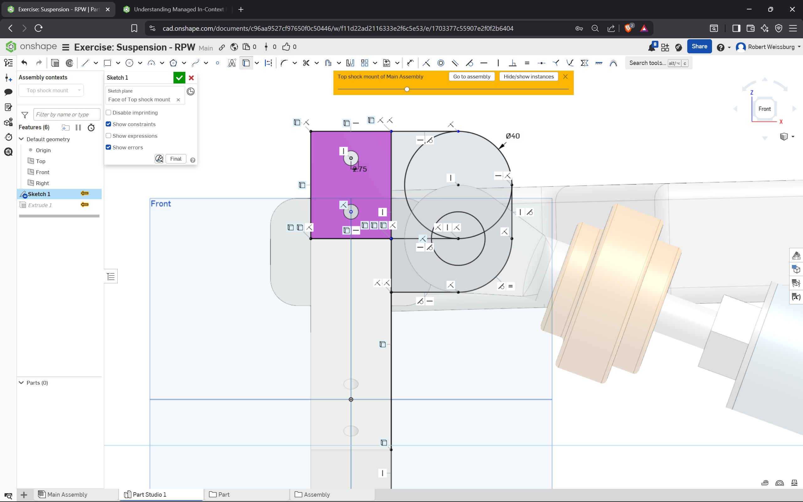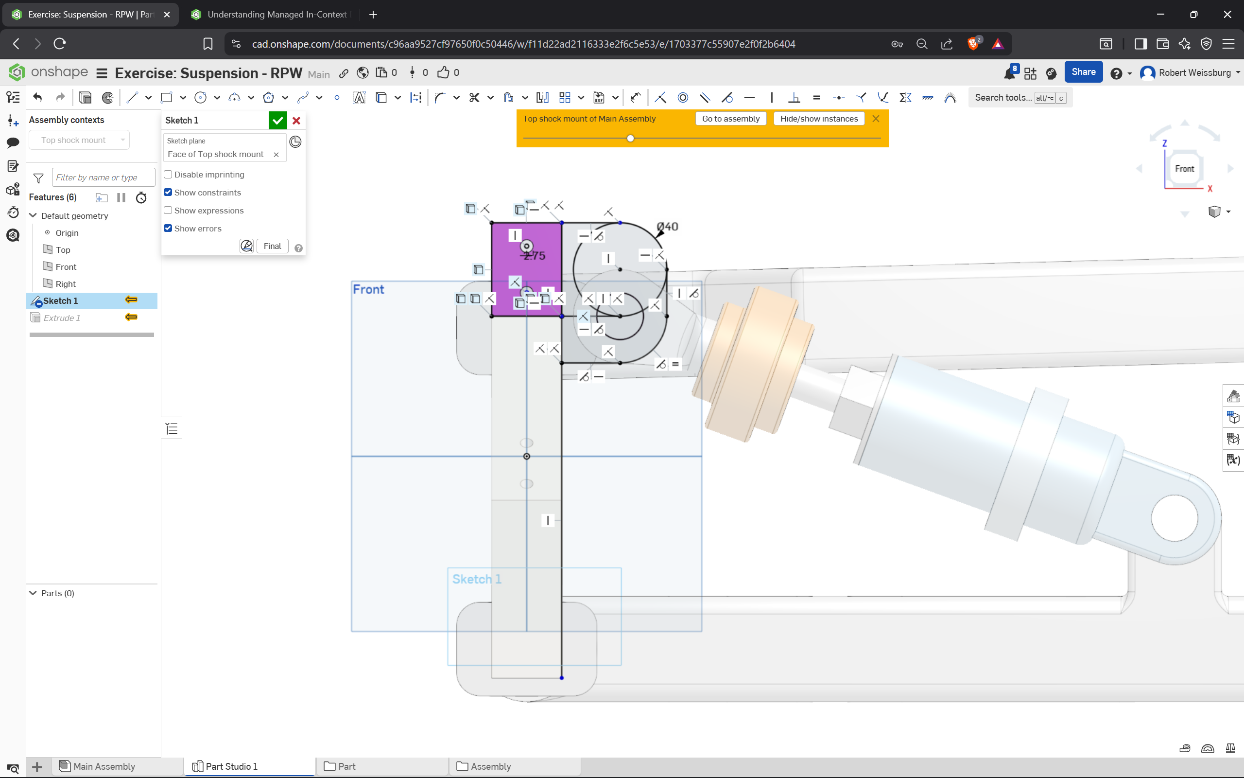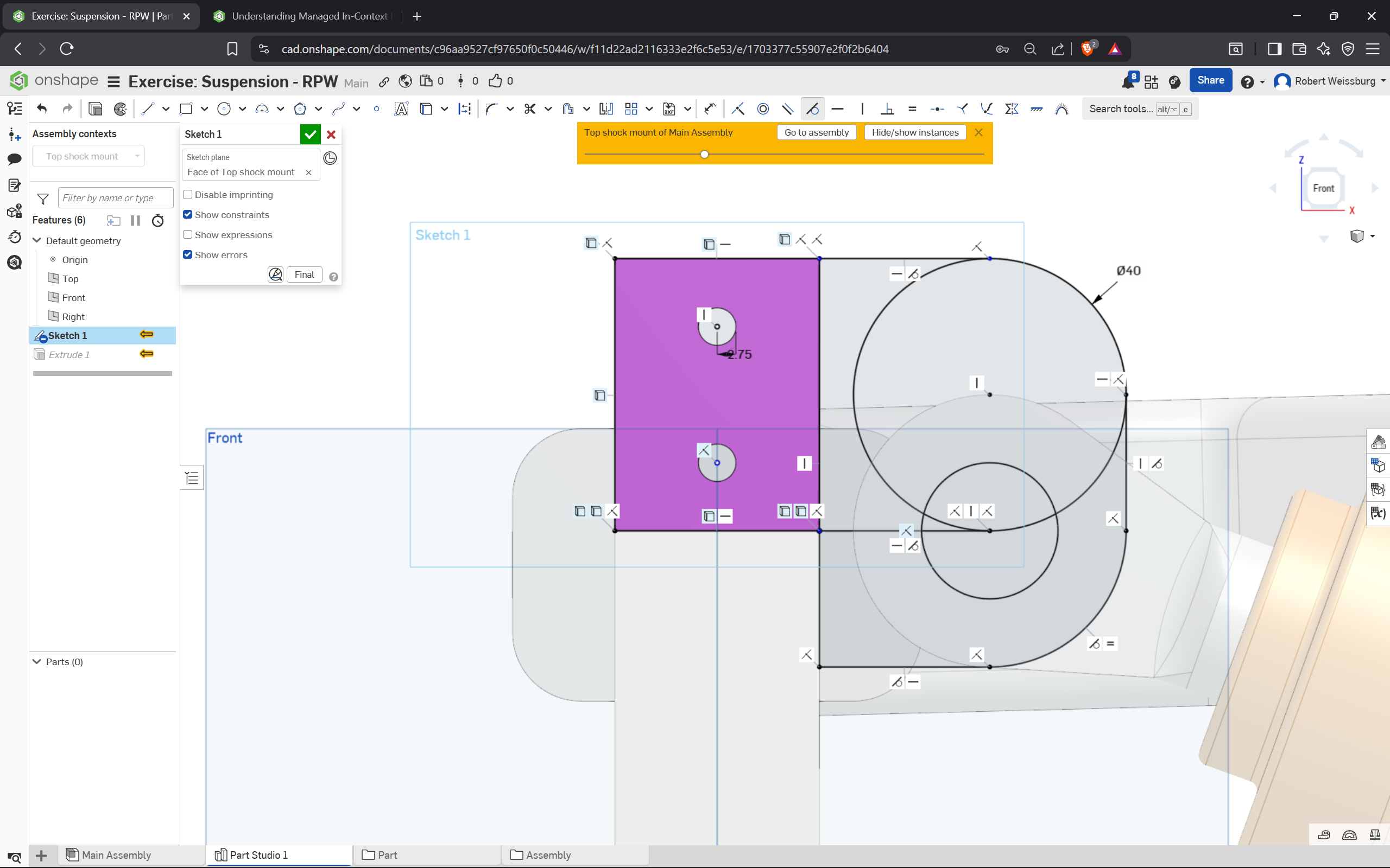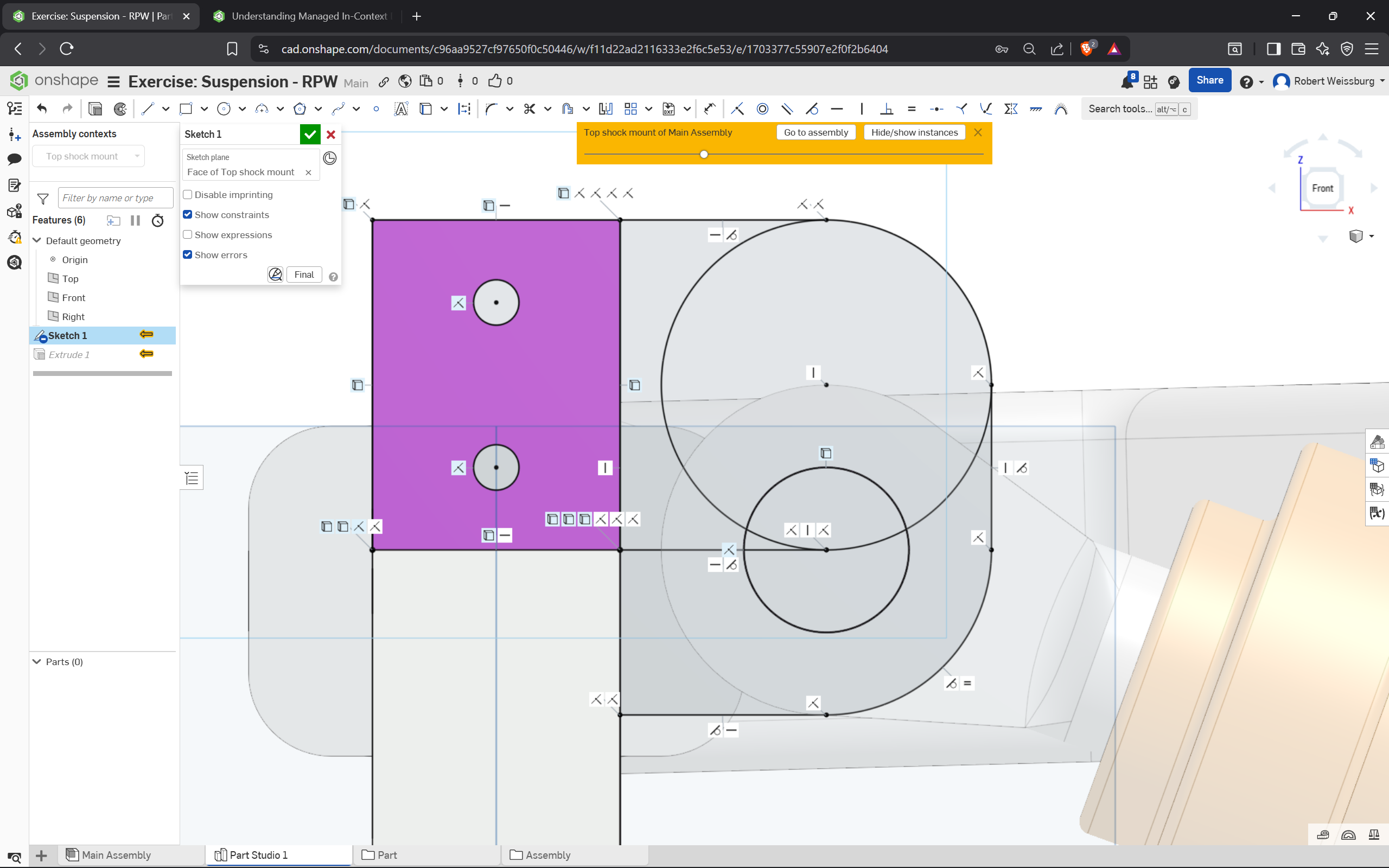 I added a few more constraints, but that didn't change the error. One thing I notice in yours and in the tutorial picture, the line on the bottom that is the right side of the angled block, running off the bottom of the image above is not part of the sketch in mine (gray), but is in yours and the tutorial. I can add a line there, but it doesn't change anything. It seems in yours it is part of the Use. I would swear that I selected the two things for the use correctly and have no idea how to alter a Use post facto.