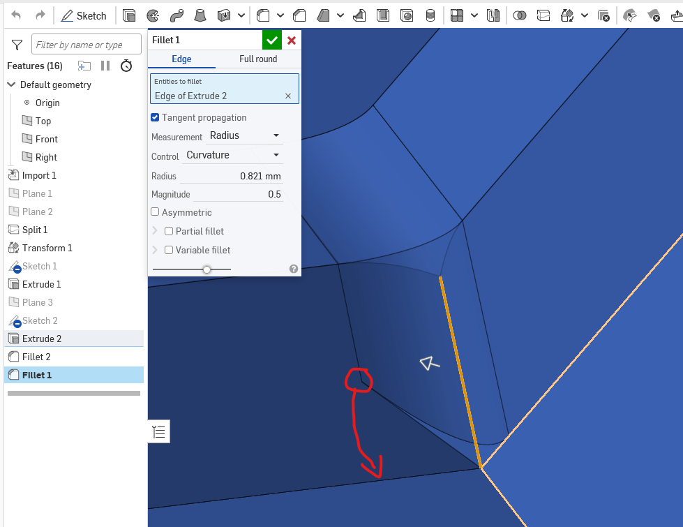 Experimenting with the partial fillet option I have been able to move that down, but I'm no left with a "beak" at the top: