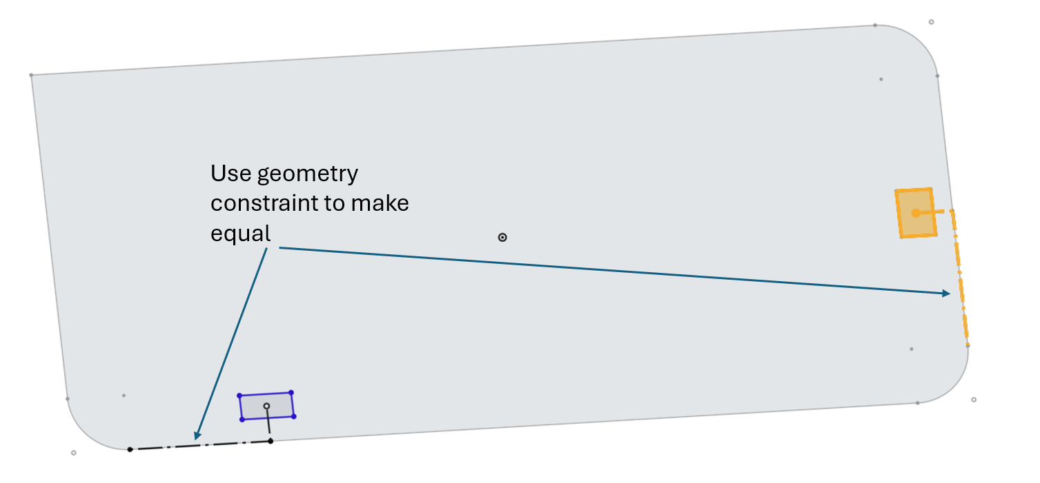 Probably the easiest way to achieve what I think you are trying to do is to use a geomtry contraint to make two reference lines equal. I know my geom is 2d whereas it looks like your sketch maybe on a 3d surface but the approach should work either way.