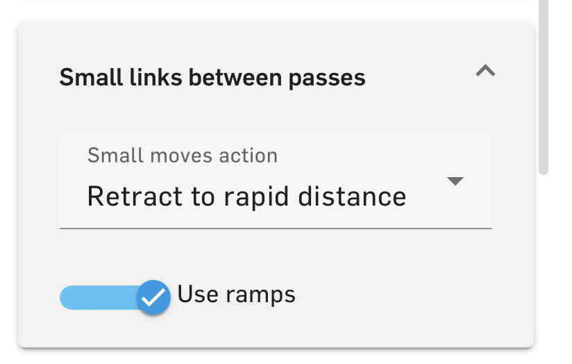 and between each depth it retracts back to the clearance distance. I can make it stop going all the way back out by changing some of the "small links between passes" parameters to 'direct' or 'spline' but then it doesn't properly spiral in to the next layer—it just plows through to the center as a move/ramp. I'm sure this is something simple I'm missing…. The 'retract to feed distance' still goes up the clearance and slowly spirals back down.