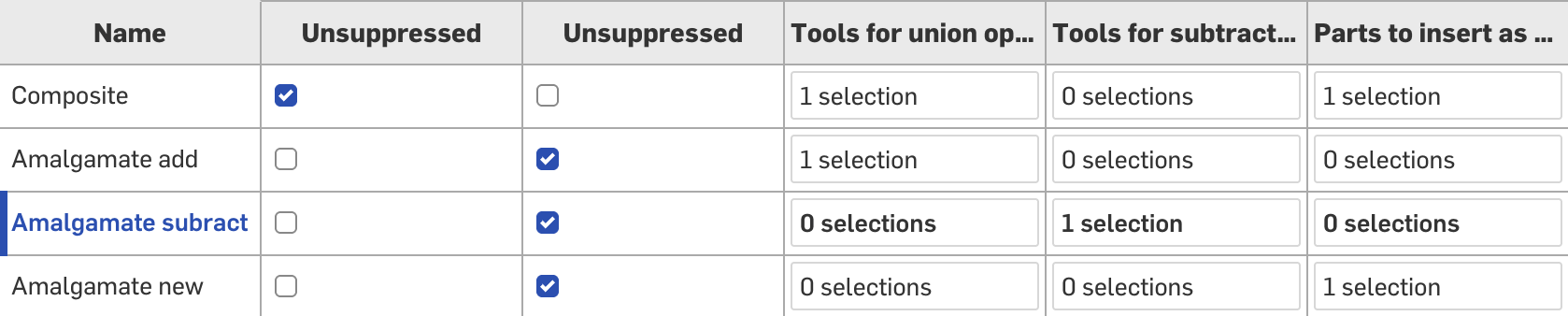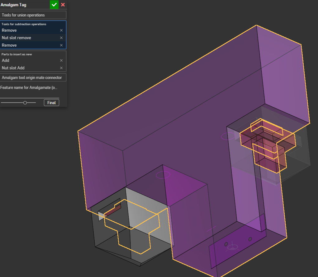 I know I could use a regular derive for that but I already have an amalgam feature that I would have liked to keep as i have multiple locations. Is there any reason you can't have more flexibility in the amalgam feature where you could have the option to not have a subtraction scope (i.e. ignore the subtraction body in the tag)? And probably also have the option to create the union bodies as new. Maybe something like a "ignore scope" checkbox?