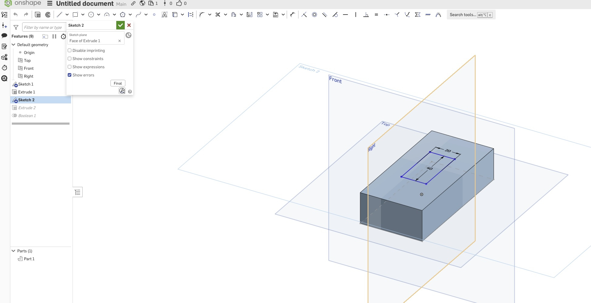 So I wanted to test this and created a new document with an extruded rectangle (Extrude 1) and a smaller extruded rectangle on top of it (Extrude 2). I wanted to subtract the smaller one from the larger one using a subtract Boolean operation, then enlarge the area of the section with Move Face so that it was visible (and I could measure it because the lines are straight).