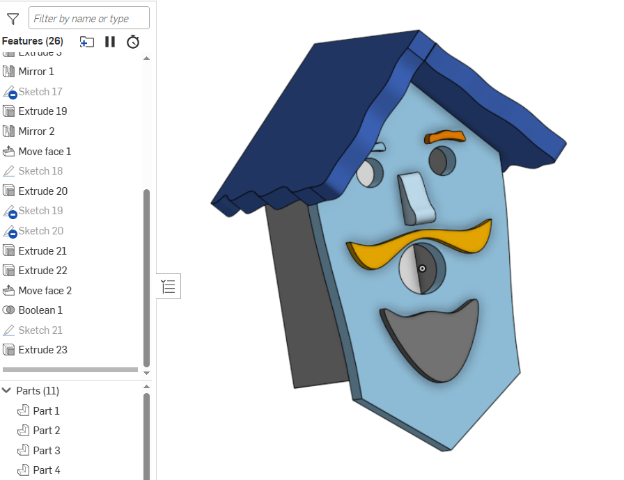 I would like to mill a few millimetres into the front of this birdhouse to create the shape of the eyebrows, moustache, nose and beard so that they are easier to attach.
