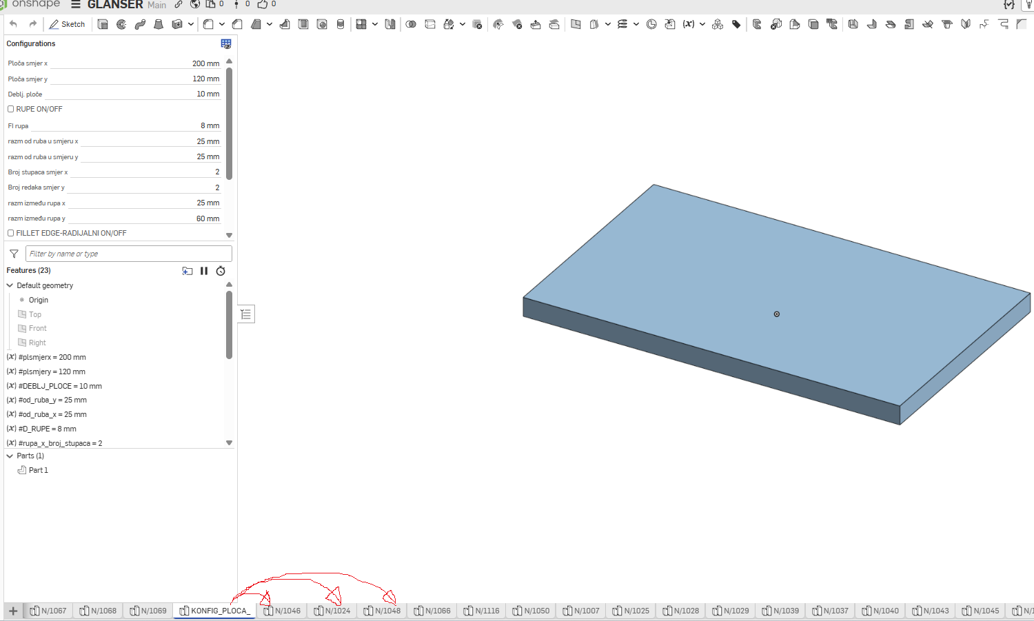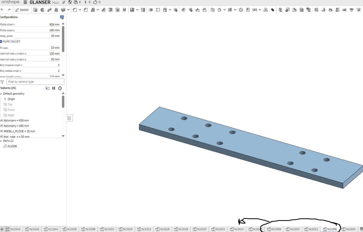 I have problem in how to use configurated parts when created. I create first that " konfig-ploča" have it in my folder. When create some new document, I want to use it like a base, for similar parts like that.. just make more variations..So I duplicate it, rename it like N/1006, N/1011,N... all those parts I will insert in assembly later. When I close my document, open it next day, I check that part N/1006, and some others it looks like its not configurated, without holes, wrong dimenzions..I attach some screenshots