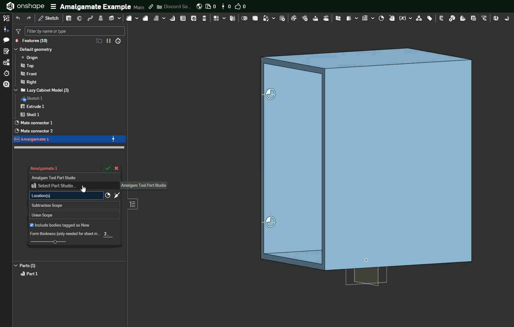 Quick gross example of cabinet hardware I pulled from McMaster Carr and lazily slapped together with bad positioning but just to prove the concept. The same philosophy of using Super Derive or Point Derive led me to developing my custom Amalgamate feature which has the advantage of allowing you to pre-define which tool bodies are meant for subtraction operations or union operations in the seed part studio, as well as letting you do both subtractive and additive operations in the same step.
