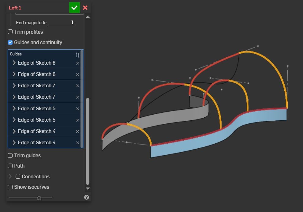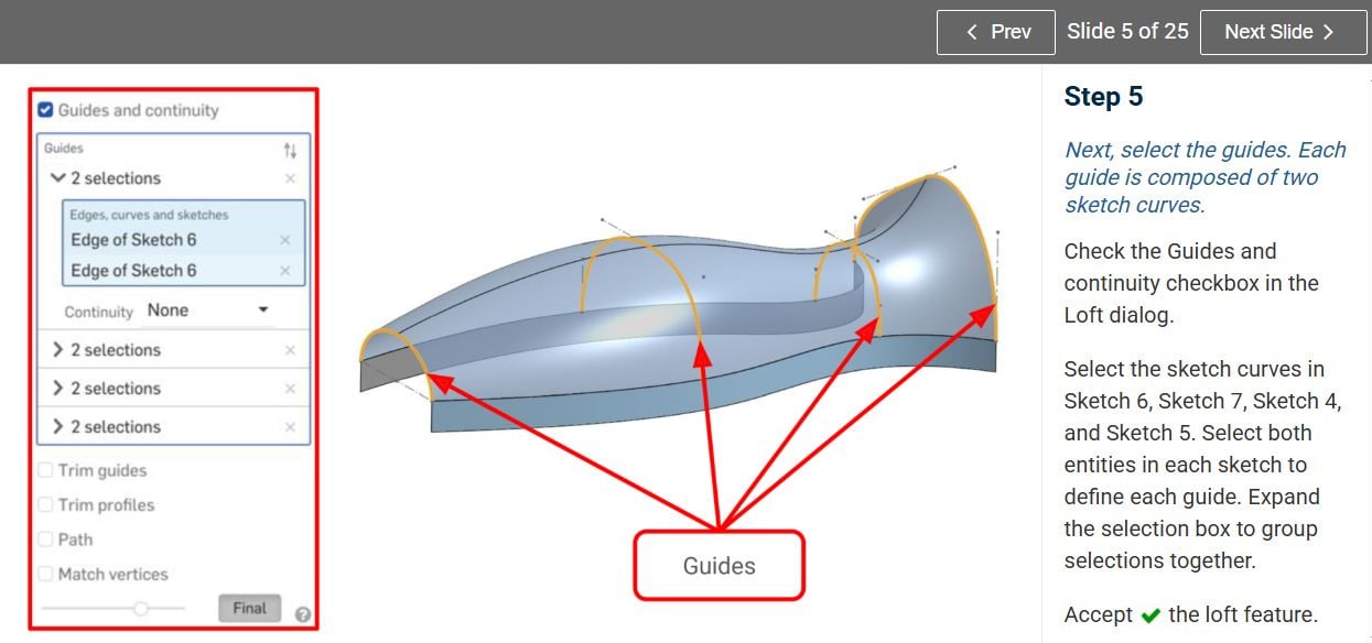 I seem to be stuck trying to create the loft on steps 4 and 5, specifically selecting the guide curves.