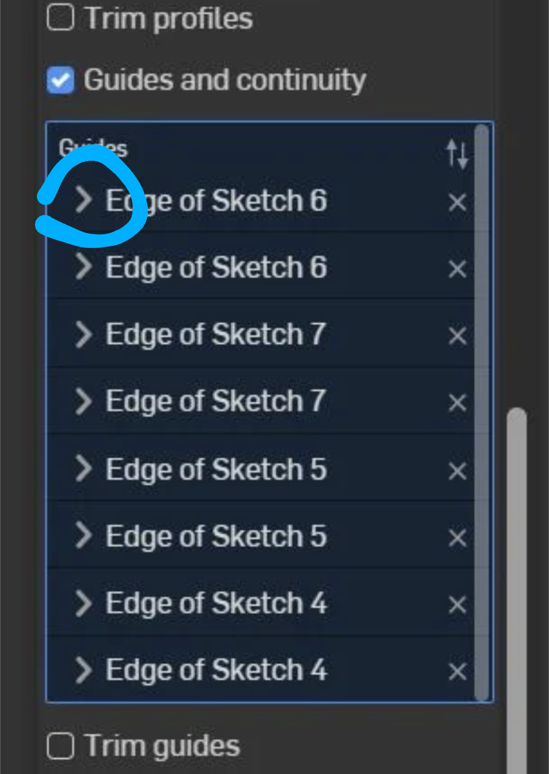 These little arrows will let you expand your selection for each guide curve "set". The problem you have right now is that each one of the curves is being treated as separate "sets".