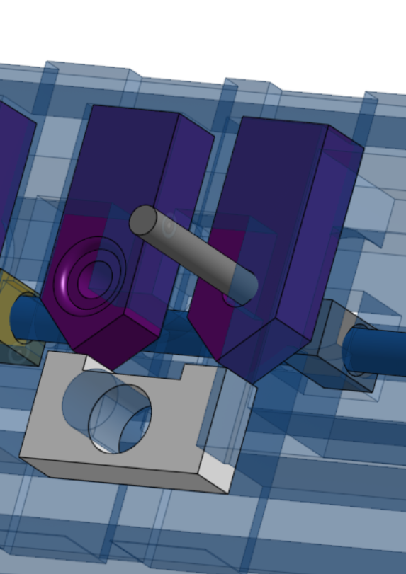 Hi, I am learning about animation and would like to ask for help. The purple sliders are supposed to eventually push buttons on the blunt end, moved by the dark grey lever. The pointy part pushes the light grey see-saw.