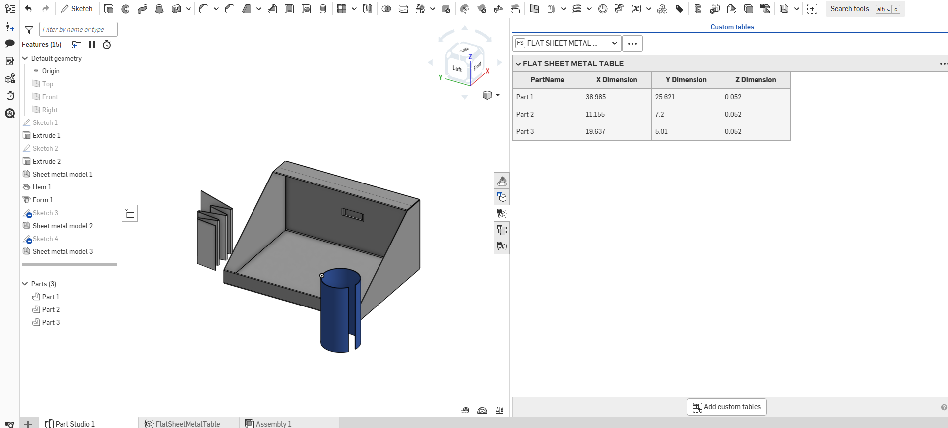 Custom table (FeatureScript) for Flat Dimensions of sheet metal parts in a Partstudio