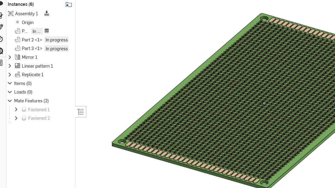 I am trying to create a model of a perfboard (a type of PCB with a regular grid of holes each of which has a solder ring). The model is simple enough, but Onshape is really struggling with the number of holes or parts created. The perfboard I am modelling has a grid of 33x54 holes, with some non-hole pads at each end. I am frequently getting hangs or even complete crashes of the app while manipulating the sketch, though once it is saved it does seem to settle down.