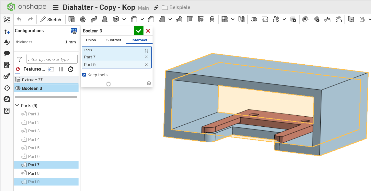 Danke für die Lösung, aber ich frage mich, ob die die ich gefunden hatte: splitten, und die Frontplatte über eine boolean Operation wieder mit dem Rest des Rahmens verbinden, wobei der Diahalter als eigenes Teil übrig bleibt, genau das das ich anstrebe, nicht die einfachste ist!