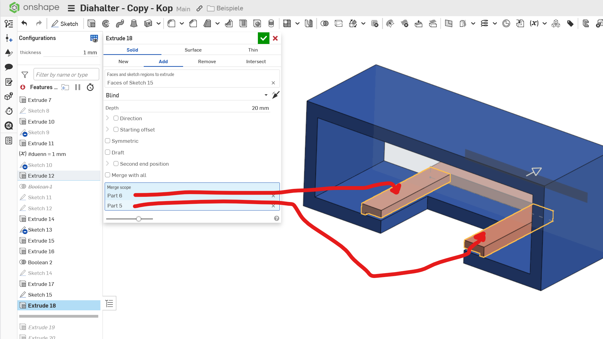 Dann hättest Du bei Extrude 18 mit der richtigen Auswahl bereits einen einzelnen Dia-Halter gehabt:
