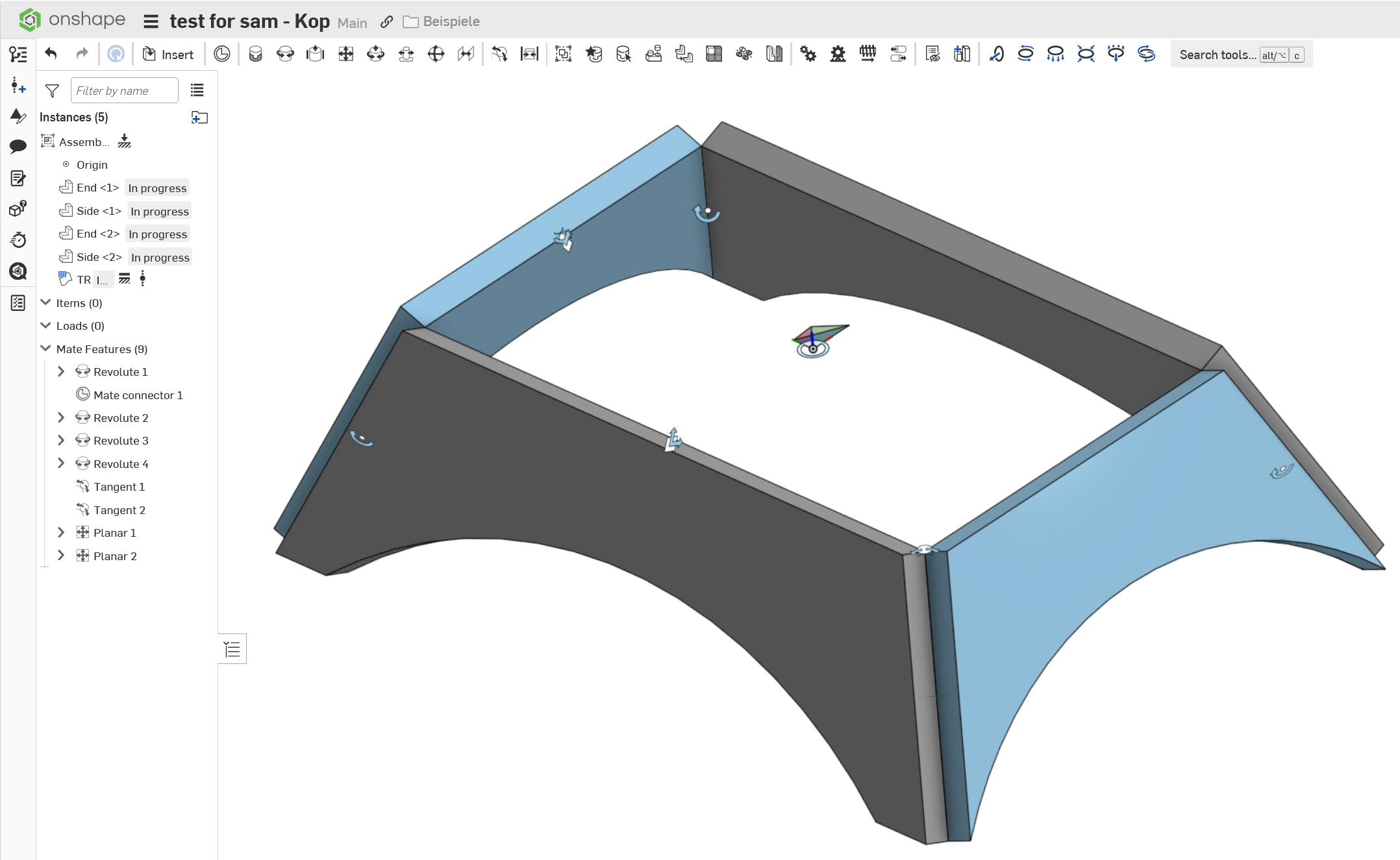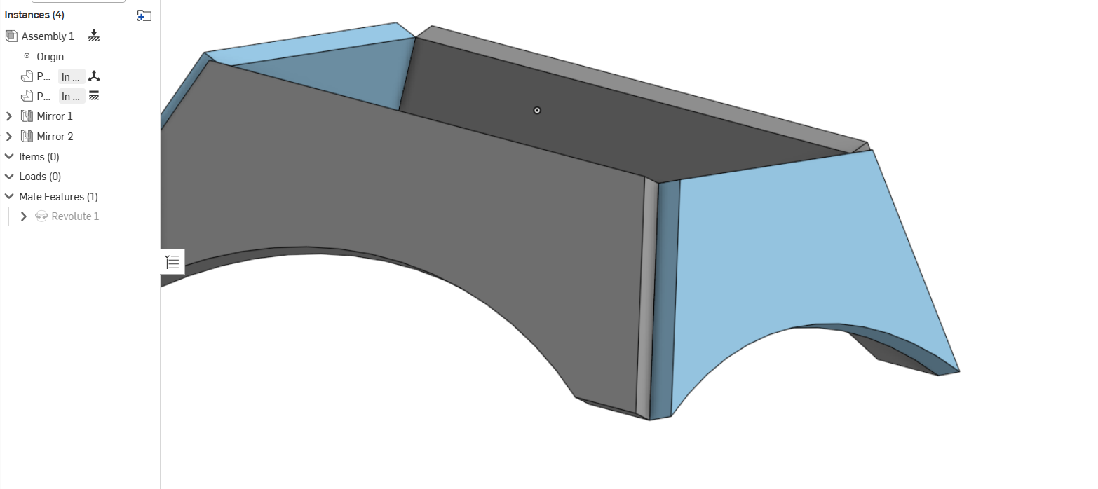 The Assembly in this folder has two parts that I want to join along the end edges resulting in both parts leaning inward, like two sides of a pyramid. I have tried Fasten mates at both the midpoint at the edge and at the top of both parts. The midpoint is close but does not want to slope both pieces. Any suggestion or solutions would be appreciated.