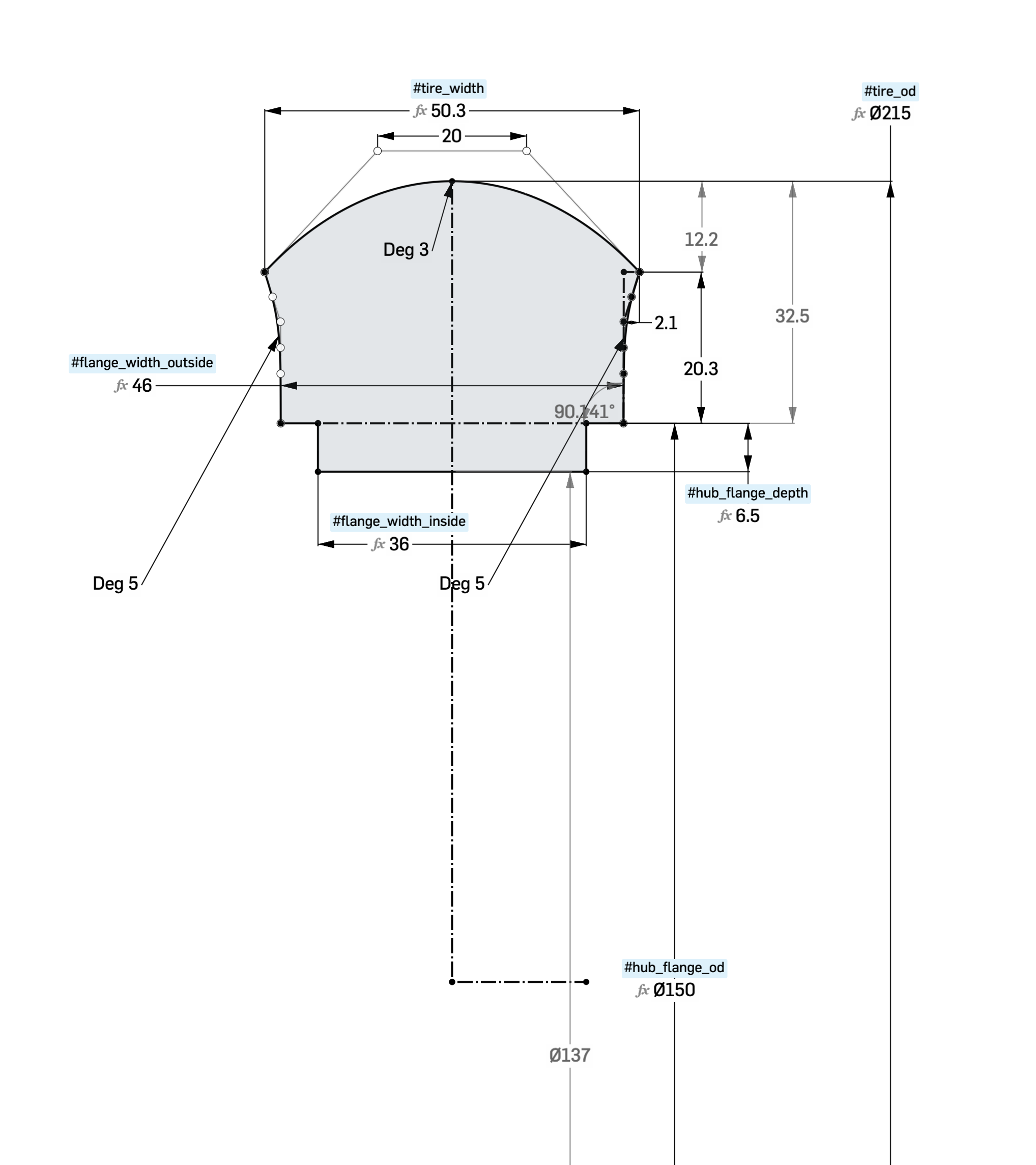 The various tire sizes for the casing I believe I have down pretty well with a similar workflow set up with variables. I still need to give it more time to work out some of the kinks with bigger changes, but I think I am on the right track there. Requiring variations of individual tread sizes to cut down on noise is the trickier part. The closest I have at the moment is to use the standard transform/scale on the lugs in 2 of the 3 directions and then using a replace face to bring the top of the lugs back to matching with the tread profile. That may be good enough for now, but with certain patterns I can see it distorting the design too much.