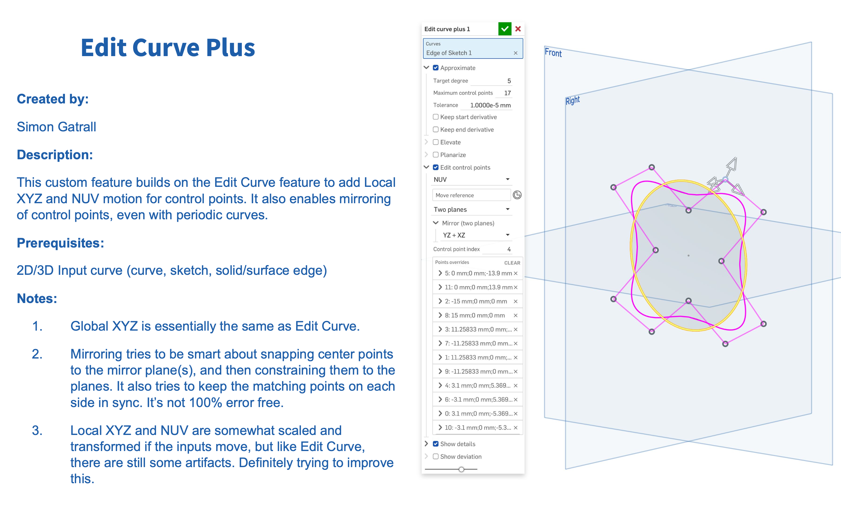 Onshape doesn't have great ways to manipulate multiple points in a feature at once, and the most natural thing to want to do with a control point "circle" is move the points symmetrically. Once again I worked with ChatGPT to whip this up. I'm sure this is not the most efficient way to do this, and it probably has a bunch of bugs, but I wanted to get it out there for people to play with. Expect this to change or break in future versions, but please do try it.