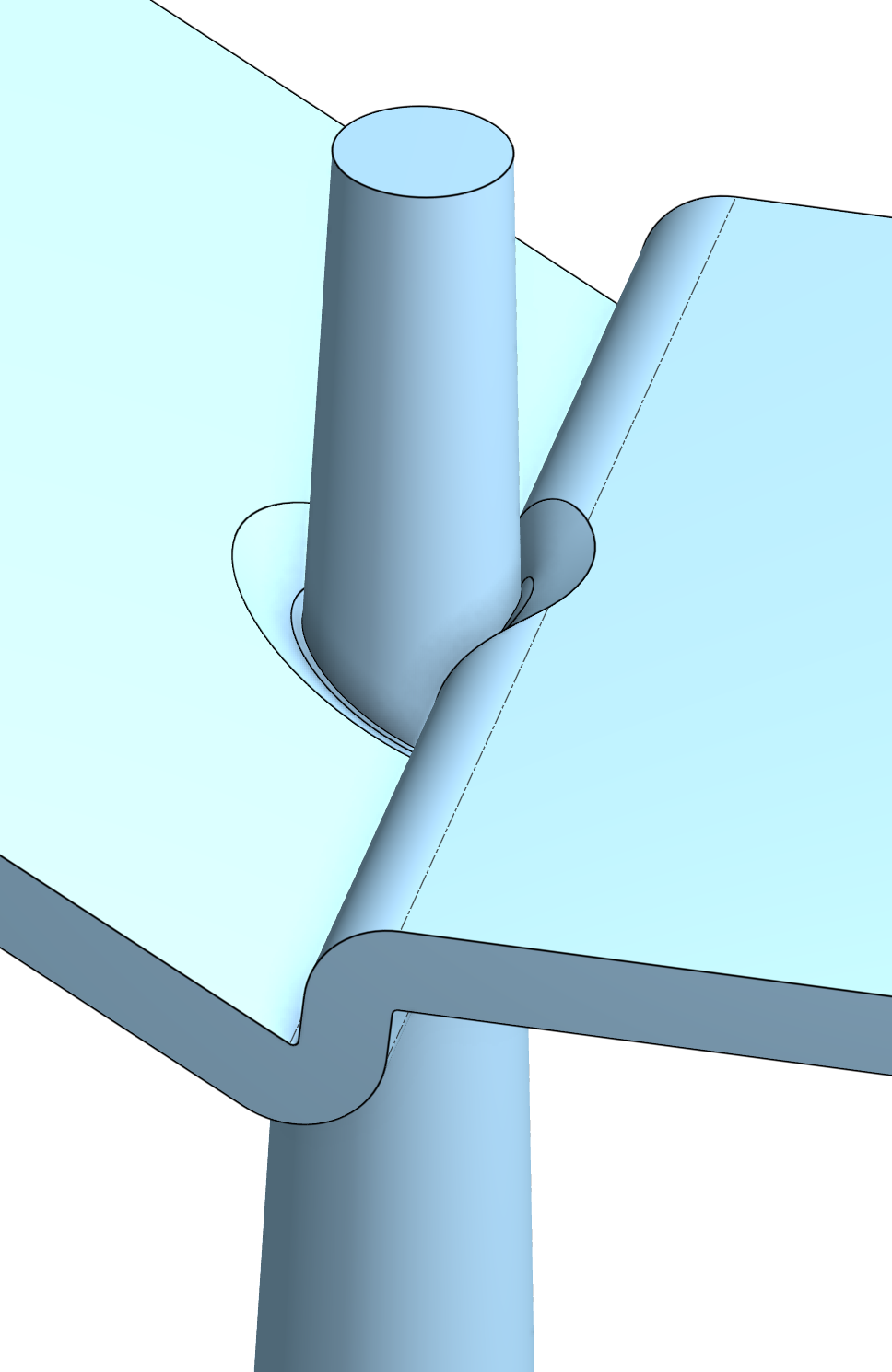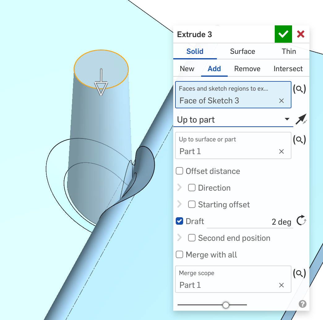 However when I try that in Onshape CAD with test cases where the undrafted cylinder doesn't overlap a tangent connected face, it does stuff like this (leaves a defect at the base of the boss on the left in this image):