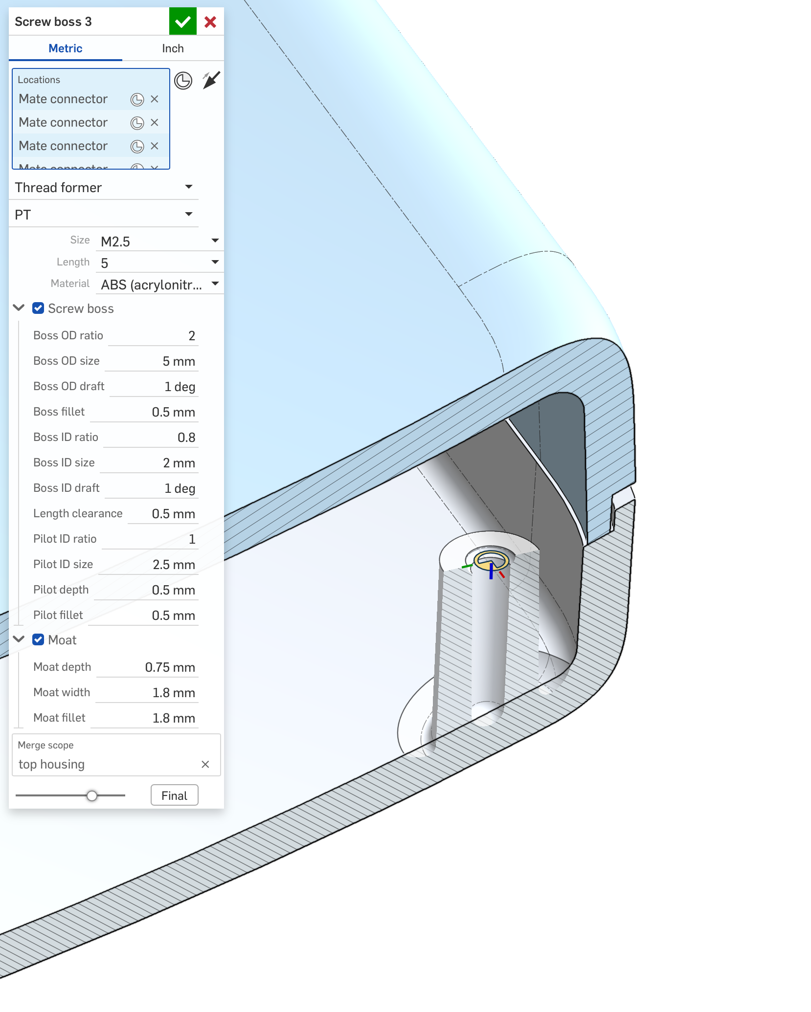 I only have the screw boss side of this working (planing on clearance boss, gusset ribs, etc), but it basically just needs a location to start with, and some choices about screw type/style/size and the material. This drives the boss geometry (OD, ID, etc) based on industry guidelines. Much like the first part hole feature, it finds the targets per location, and does the right things - magically.