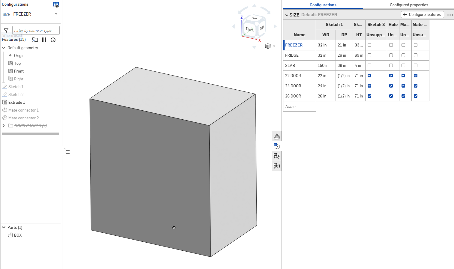 Or a more complex approach, perhaps like branching BOX Configs Part Studio to say PANEL, SLAB & APPLIANCE Part Studios?