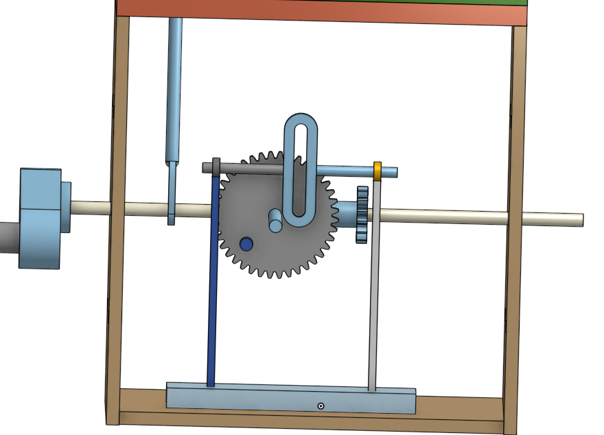 I am trying to make it so that whenever the handle (blue) is rotated, both gears turn, causing the scotch yoke mechanism to work properly, but currently I am having problems with the final mate connector connecting the blue oval piece to my gear extrusion.