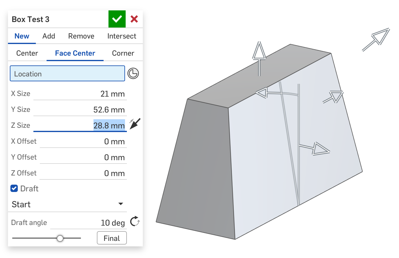 When I set up a pretty simple test feature, it took me a lot of flipping and axis choices to get to the point where I finally got the draft manipulator on this in the right orientation:
