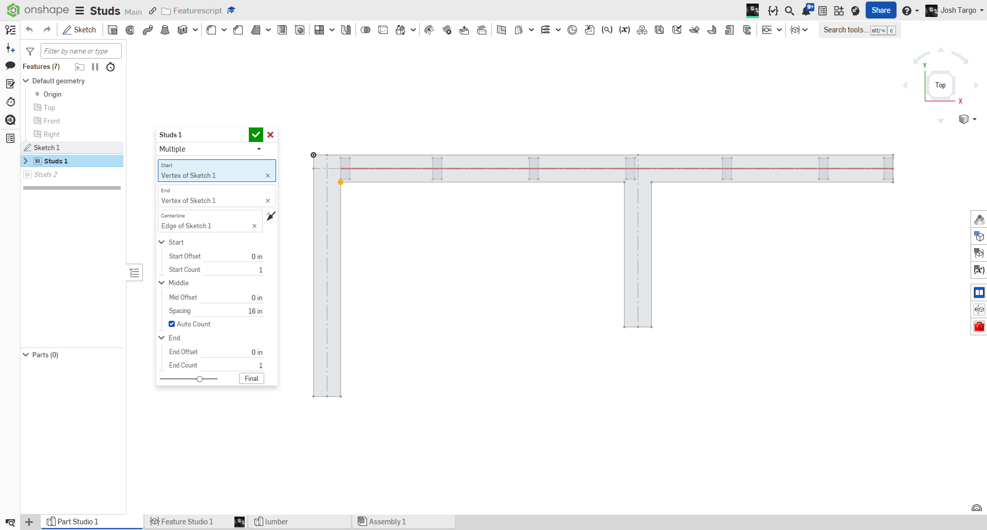 Start and End points are projected onto the centerline, and then it creates one or more start studs, then multiple Middle studs at 16" OC (or adjustable) and then one or more End studs.
