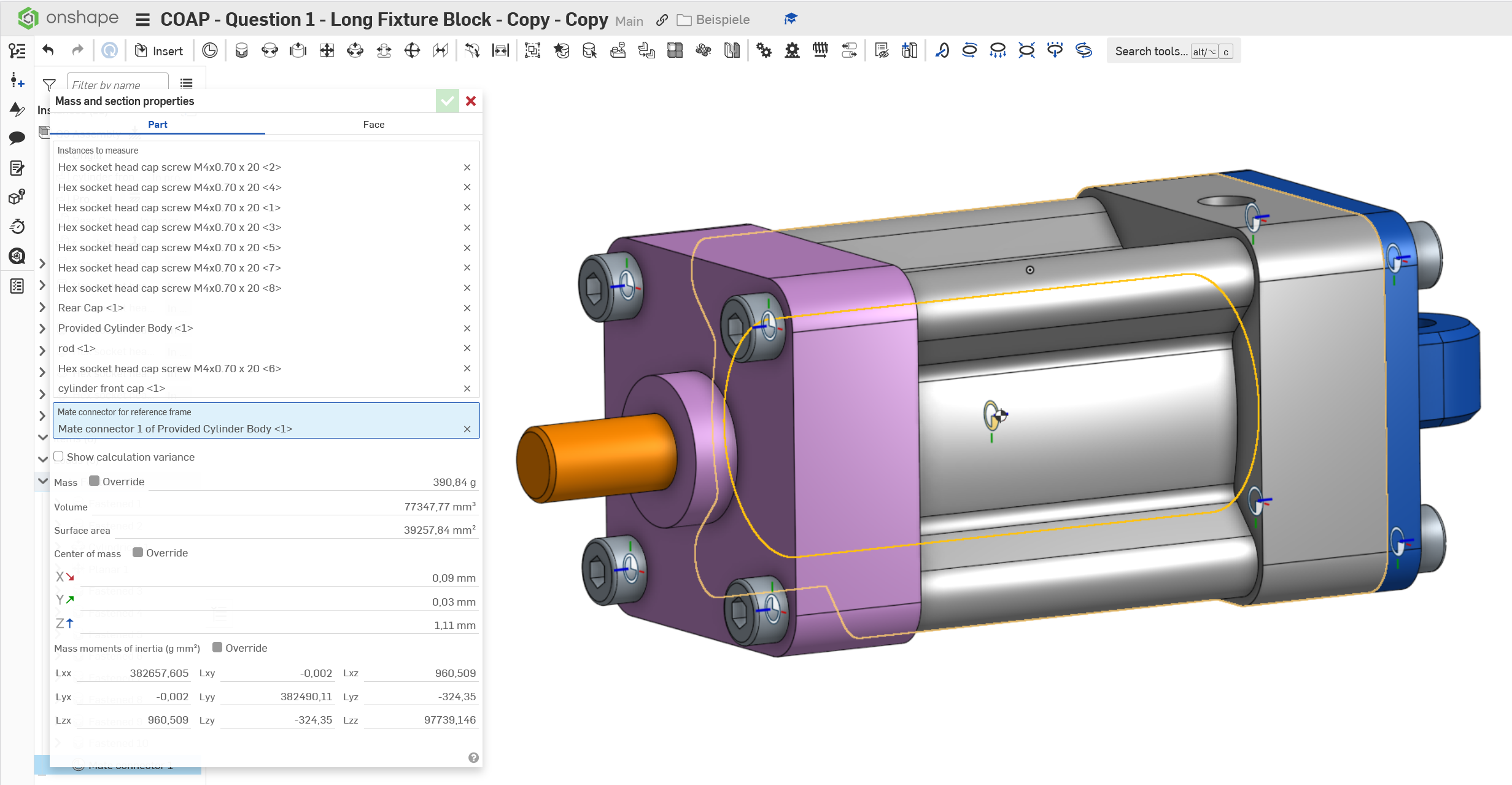 Was the cylinder meant to be placed off center relative to the origin? If not, that would affect CofM coordinates, if you didn't specify an appropriate MC for the mass properties reference frame, for calculations woud default to the origin.
