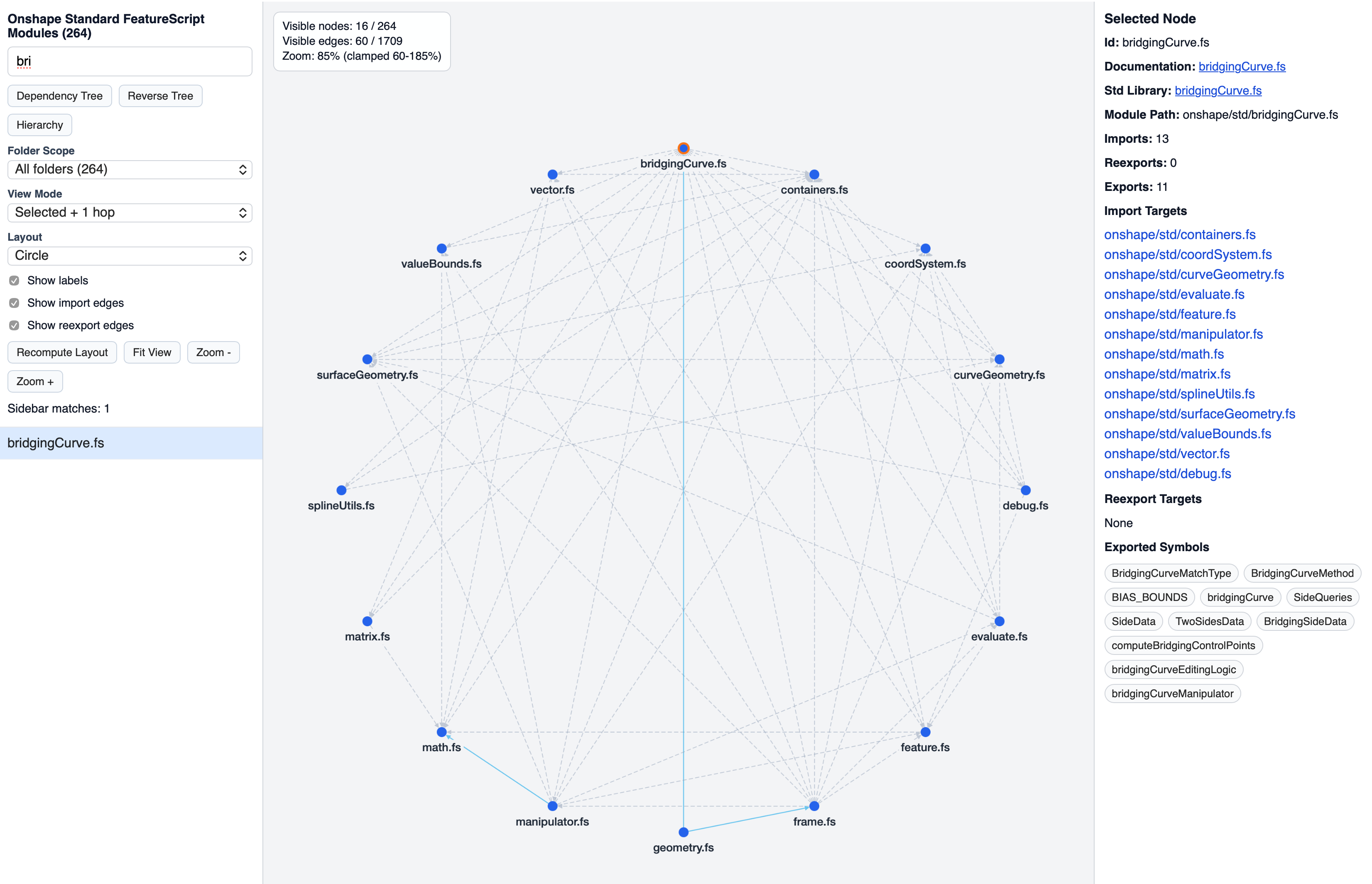 Node id should be a stable string; prefer the root-relative file path OR the module path string if consistent.UI requirementsFull-screen graph view with pan/zoom.Left sidebar:search box (filters nodes by substring match on label/id)list of matching nodes (click selects and centers)Right sidebar (or bottom panel):selected node details: id, filePath, counts, lists of imports/reexports (clicking a referenced module selects it)Visual distinction:Edge kind "import" vs "reexport" should be visually distinct (e.g., dashed vs solid).You can keep node styling minimal.Repo layout (suggested)/src (React app)/tools/indexer.ts (Node script)public/graph.json (generated)package.json scripts:"dev": vite"build": vite build"index": tsx tools/indexer.ts (or ts-node) with args parsing"preview": vite previewAcceptance criterianpm run index -- --root <dir> completes without errors on a real stdlib tree and produces public/graph.json.npm run dev loads the graph and renders nodes/edges.Clicking nodes and sidebar navigation works.README.md explains setup and includes an example command using a local stdlib clone path.Implementation notesKeep parsing regex-based; no need for a full FeatureScript parser.Be careful to not treat commented-out imports as real (best effort: strip // line comments and /* */ blocks before regex).Handle duplicate edges gracefully (dedupe).If graph is huge, still load it; don’t over-optimize—this is MVP.Please implement the full project, create all files, and verify by running:npm installnpm run index -- --root <some placeholder path; if not available, at least run the script with an empty temp folder and show it handles it>npm run buildAfter that, there was a lot of dialing in of UX/UI, and adding the links to the docs and codebase, but surprisingly easy. Part of a day's work.