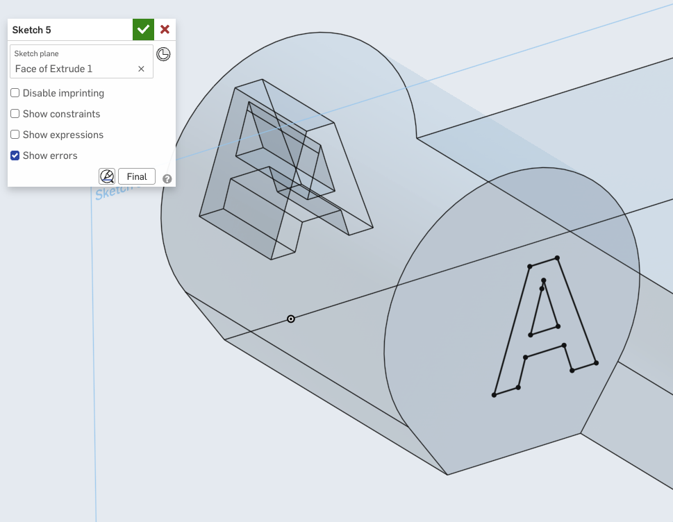 Recreating that on the other side and getting it match perfectly would be a pain. So instead I create another sketch on the other side, select the edges of the A that I want, then click "Use":