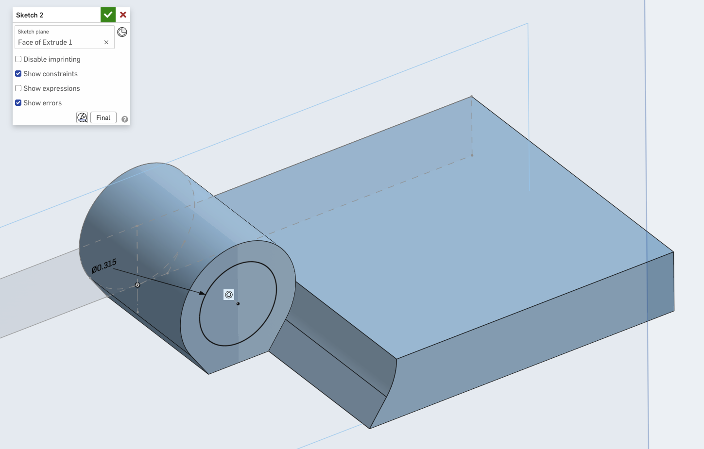 But from the video I judge your instinct is correct. In Onshape you don't really need the Project/Use in this instance. I dont use Fusion that much so I can't say why the modeler is doing it this way. They are make a circular boss on in the inside face of the hinge bearing. The way this would be accomplished in Onshape is creating a sketch on that inner face and then creating a circle, and then adding a constraint to that circle to make it concentric to the hinge bearing: