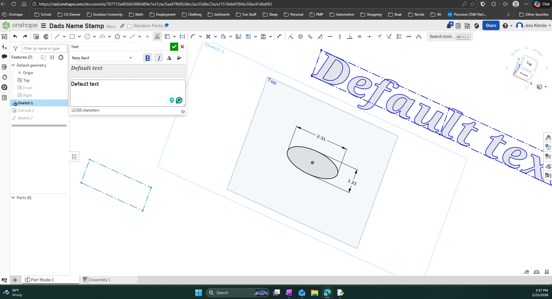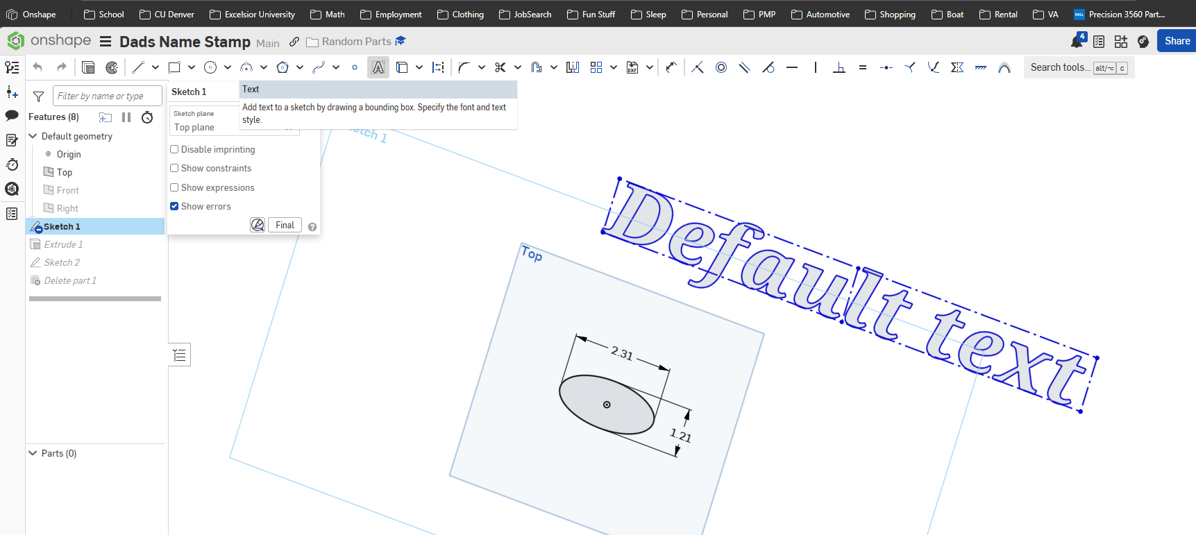 My problem, I cannot figure out how to get the text to follow a radius. The only thing my student account will let me do with text is write in a straight line and invert the text, but nothing I do lets me put it on an arc like his old stamp was. I've googled this question, and according to Google, it should be easy, but at this point I don't know what I'm missing, and I don't have time to keep chasing my tail.